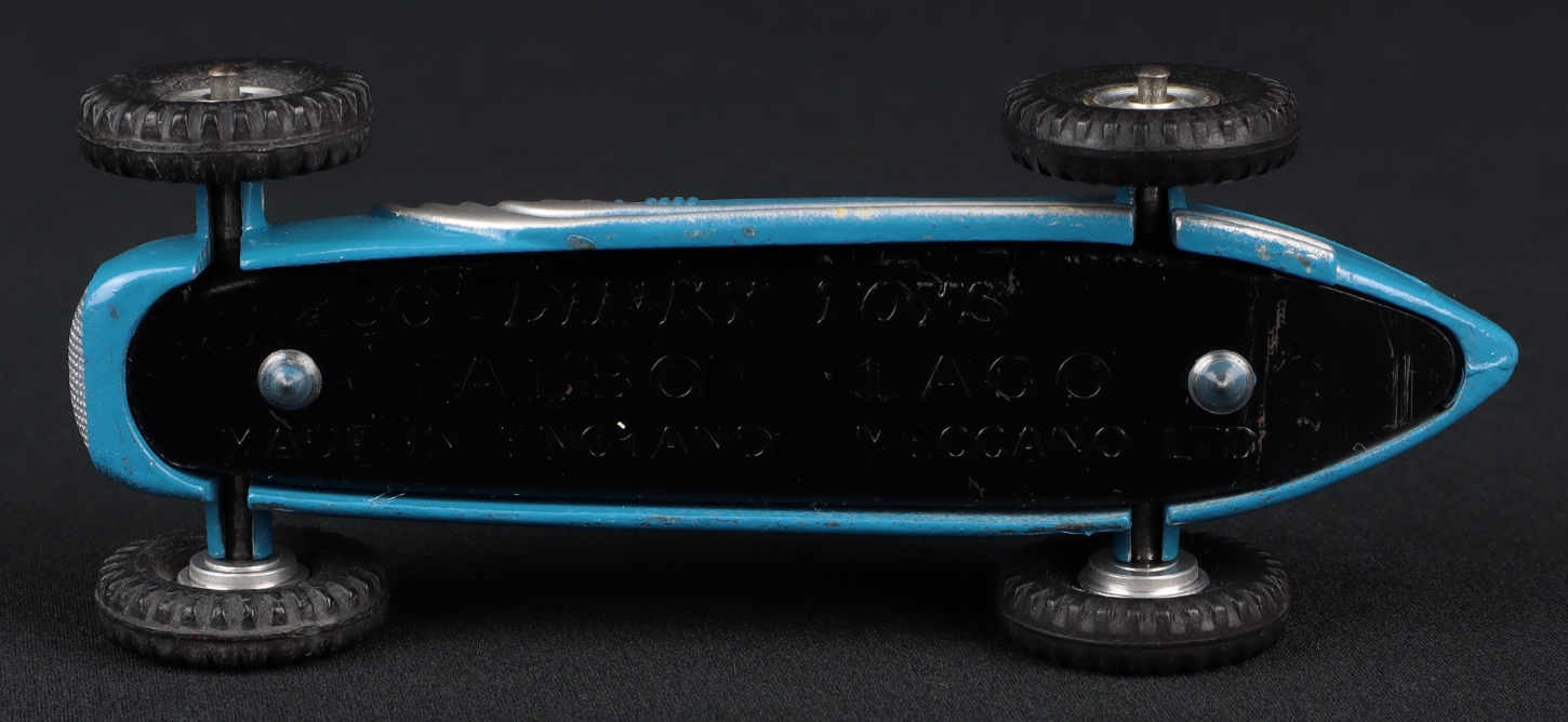 A sought-after classic Dinky racing car made between 1954-60. Fresh shining light blue finish, silver trim and bright baseplate. Rare with spun wheels. Well-shaped black original treaded tyres with ‘M’ for Meccano stamped.