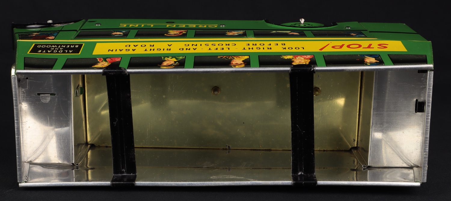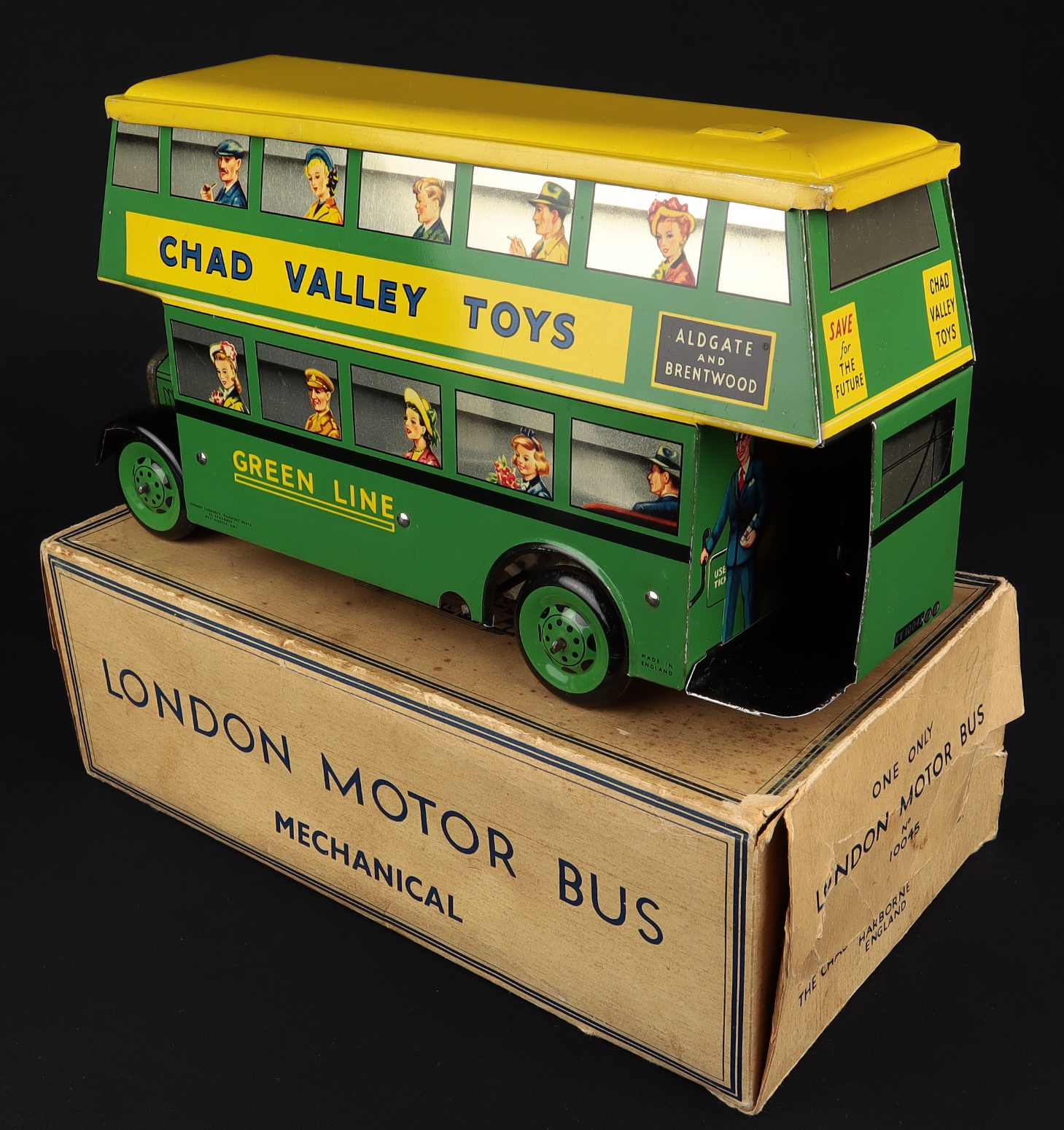 London Motor Bus 'Green Line' by Chad Valley Models, No. 10045. Tinplate clockwork Bus. Very near mint/boxed. Lift-off lid (for storing biscuits). Scarce. From The Denis Tyler Collection. Starting bid £200. Please note that QDT apply 12.5% buyer's commission.
