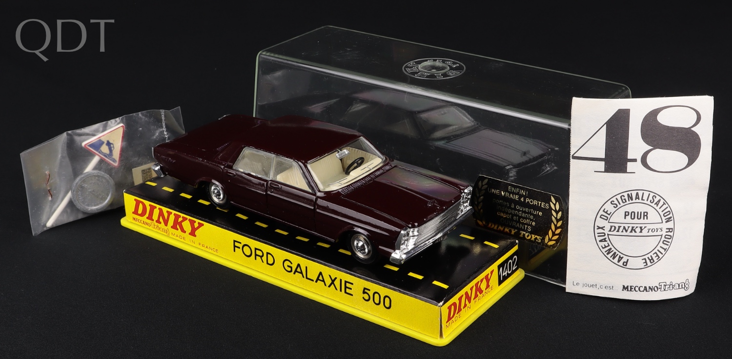 Ford Galaxie Sedan from French Dinky Toys 1402. Dark brownish-burgundy. Very near mint/boxed. With still-sealed Accessory Pack. Scarce. From a most knowledgeable & enthusiastic collector in South London.