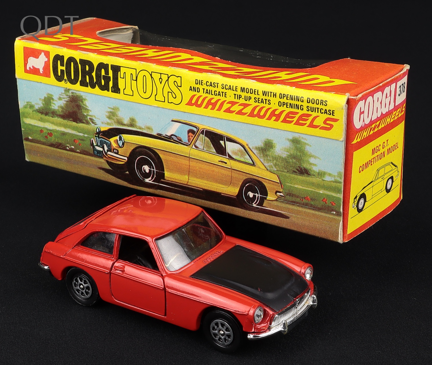 MGC G.T. Competition Model by Corgi Toys, No. 378. Very near mint/boxed, with suitcase. Very scarce LATE version with ROSTYLE whizzwheels. From The Gower Collection.