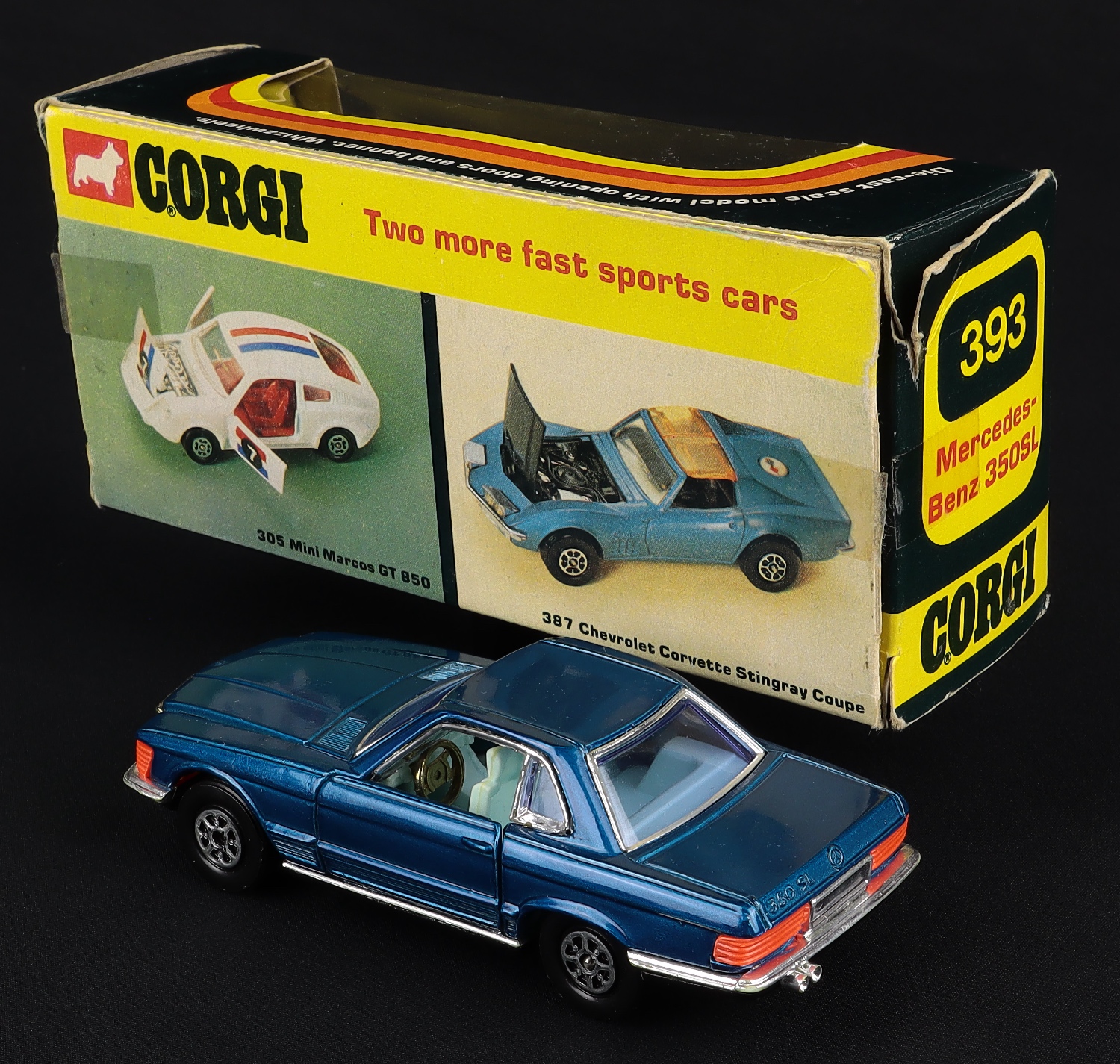 Mercedes Benz 350SL by Corgi Toys, No. 393. In PEACOCK BLUE, a more unusual find with NO SILVER SIDE DETAIL & ROSTYLE WHIZZWHEELS. Very, very near mint/boxed. From The Gower Collection. Starting bid £125. Please note that QDT apply 12.5% buyer's commission.