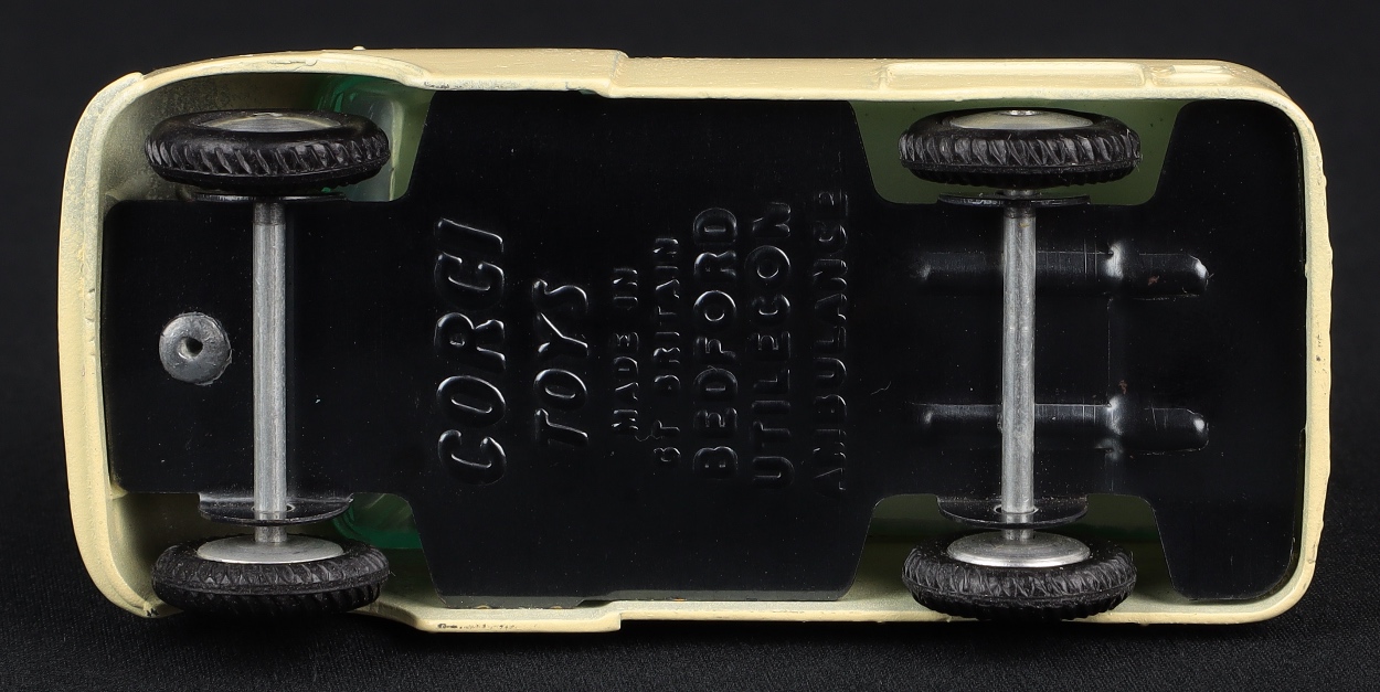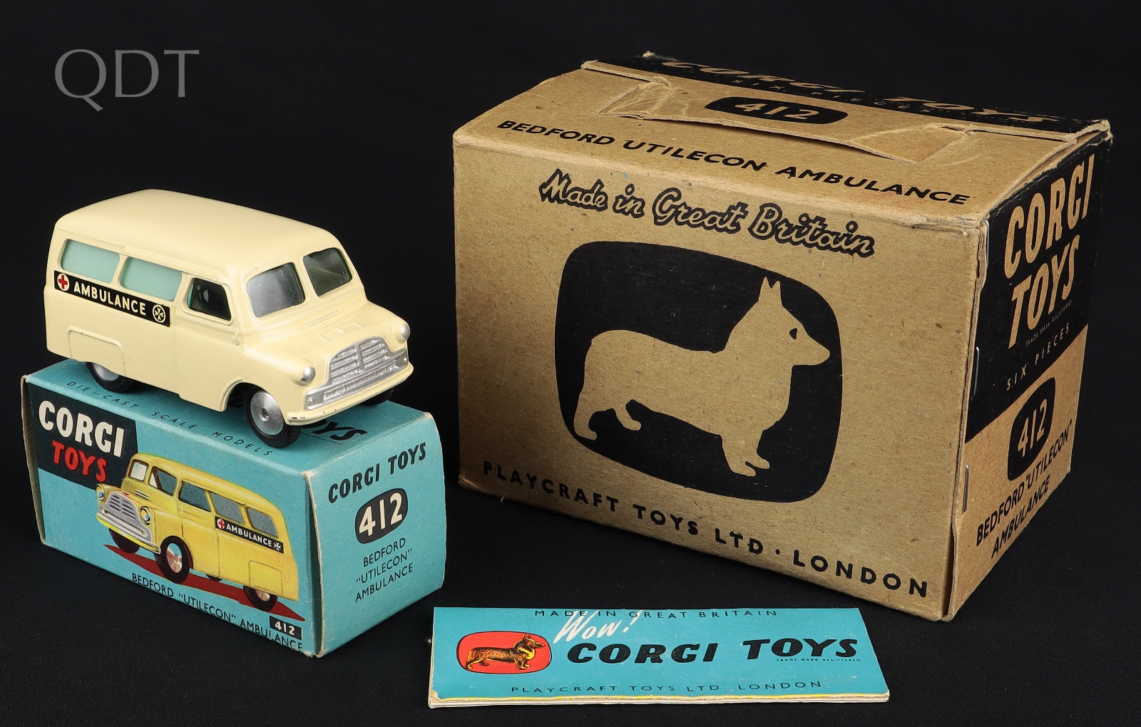 Bedford "Utilecon" Ambulance by Corgi Toys, No. 412. First issue in cream with a divided windscreen. Very near mint/boxed, with colour promotional booklet. With Trade Carton. From The Esteemed Spa-Francorchamps Collection. Starting bid £180. Please note that QDT apply 12.5% buyer's commission
