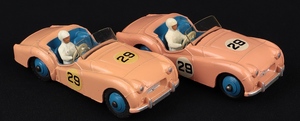 A very close to perfect example issued between 1956-59 in lighter salmon pink (competition) finish, with finer racing number 29. Bright mid-blue seats and hubs, white driver. Intact windscreen.