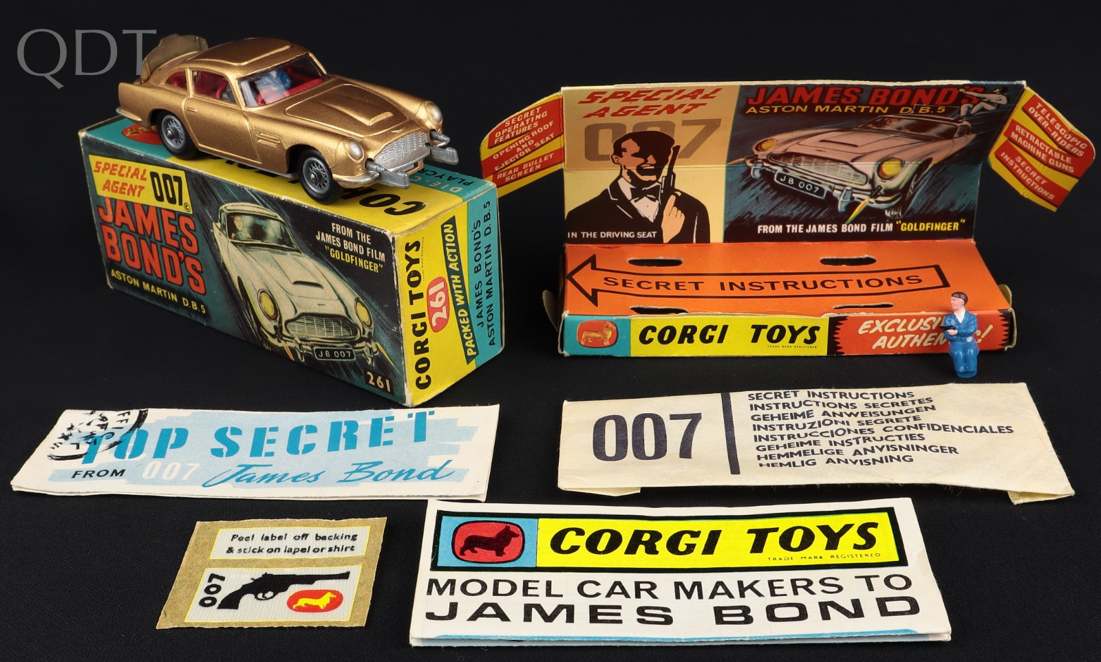James Bond's Aston Martin D.B.5 by Corgi Toys, No. 261. Gold issue. Very near mint/boxed. 1st issue WITH INDICATOR LIGHT CASTING. 2nd issue style box with close to pristine, full Instruction Packet & International colour Booklet 'Model Car Makers to James Bond'.