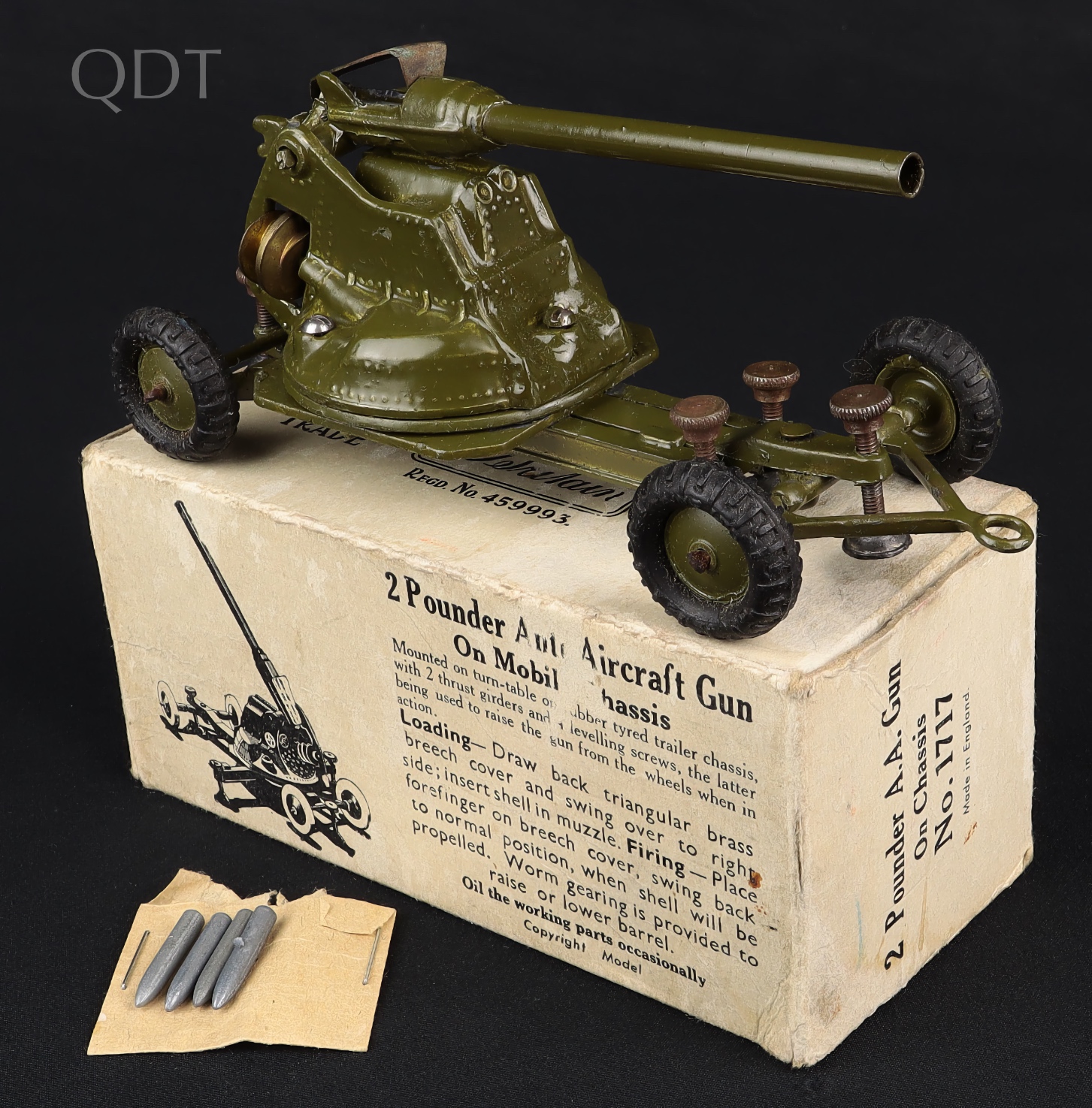 2 Pounder A.A. Gun on Chassis by Britains No. 1717. Very near mint/boxed. Early issue. With opened packet containing shells. Another scarce model from The Denis Tyler Collection. Starting bid £75. Please note that QDT apply 12.5% buyer's commission.