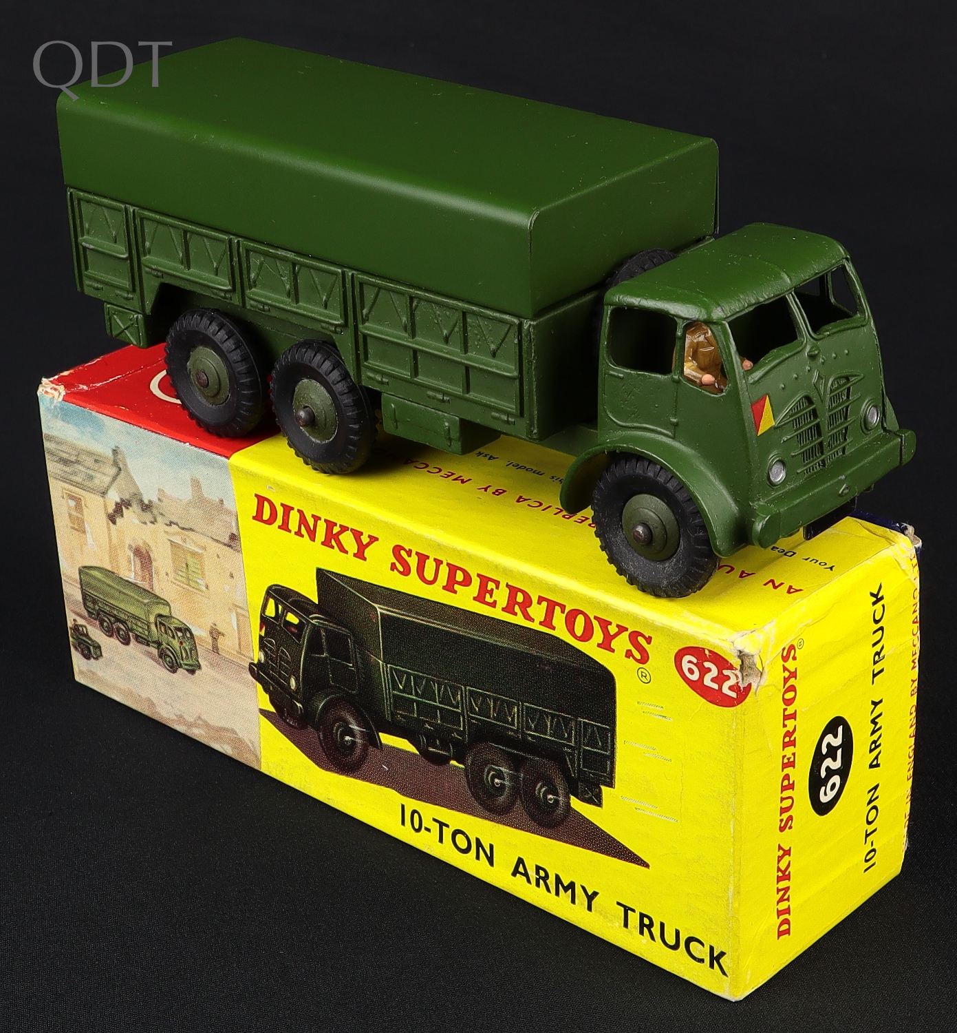 10-Ton Army Truck by Dinky Toys, No. 622. MATTE finish. Late issue with plastic driver. Very near mint/boxed (ITALIC SUPERTOYS PRINT). Scarce PICTURE Box. From The Berlin Collection.