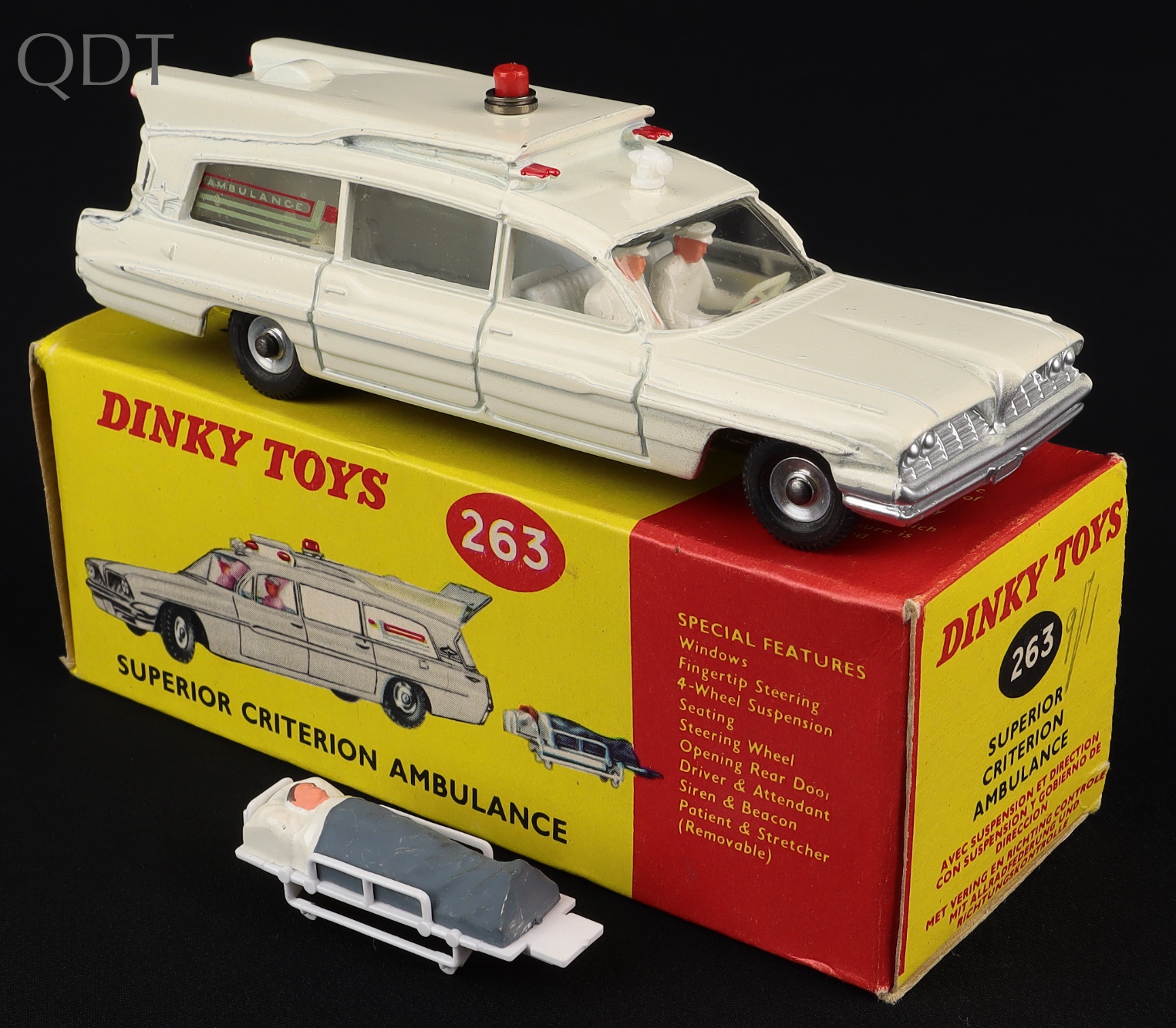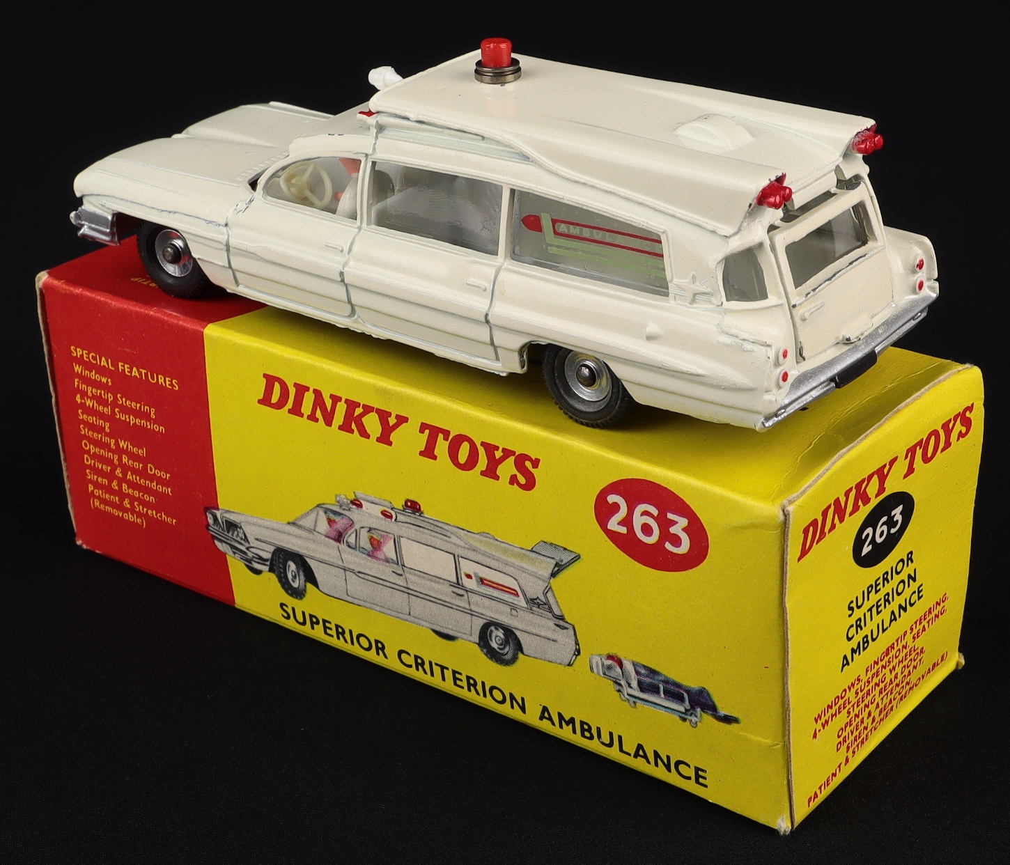 Superior Criterion Ambulance by Dinky Toys, No. 263. Off-white version WITHOUT red side stripe. With WHITE INTERIOR, MATTE BASE. Rare issue. Very near mint/boxed. Stretcher figure . From The Rickman Collection.