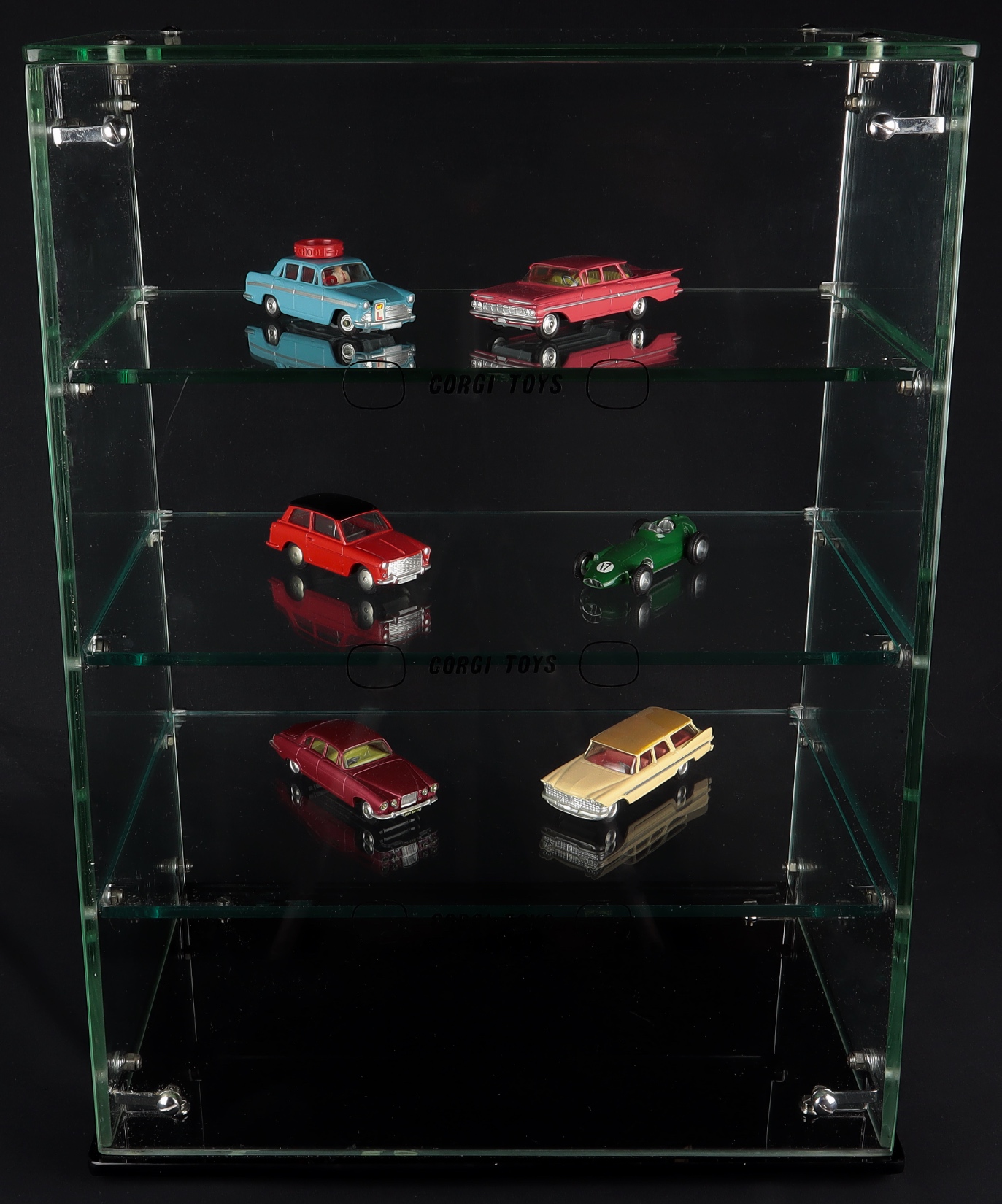 A delightful 1950’s period Corgi Display Cabinet made entirely of glass and measuring 38cms wide x 51cms high x 24cms deep at the base (designed to taper, so the lowest shelf is deeper than the highest).
