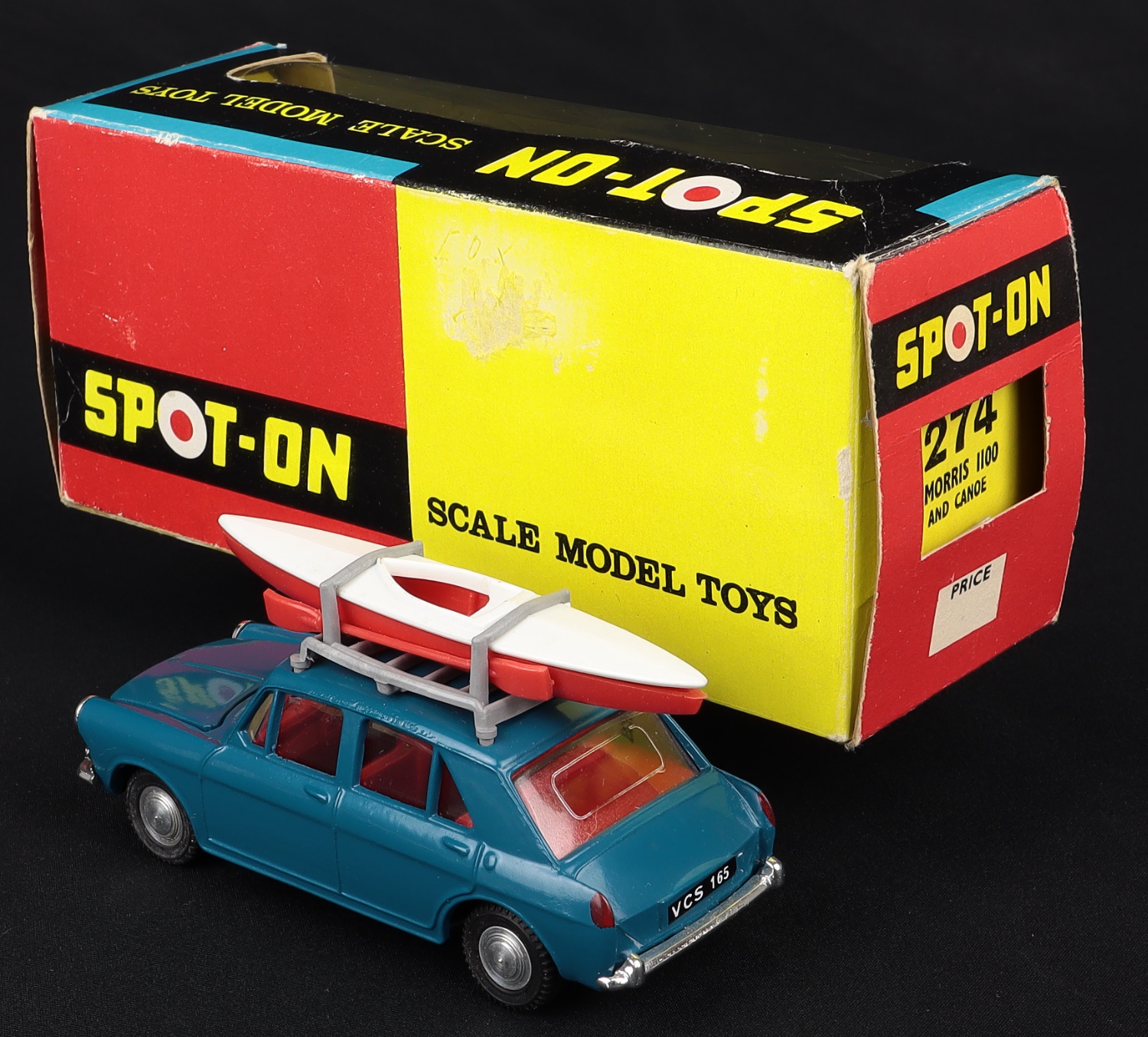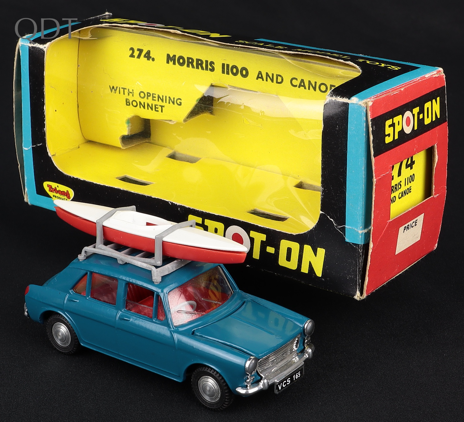Morris 1100 & Canoe by Spot-on Models, No. 274. KINGFISHER BLUE issue, with red & white canoe. Scarce. A First for QDT! Very, very near mint/boxed. From The Heart of England Collection.