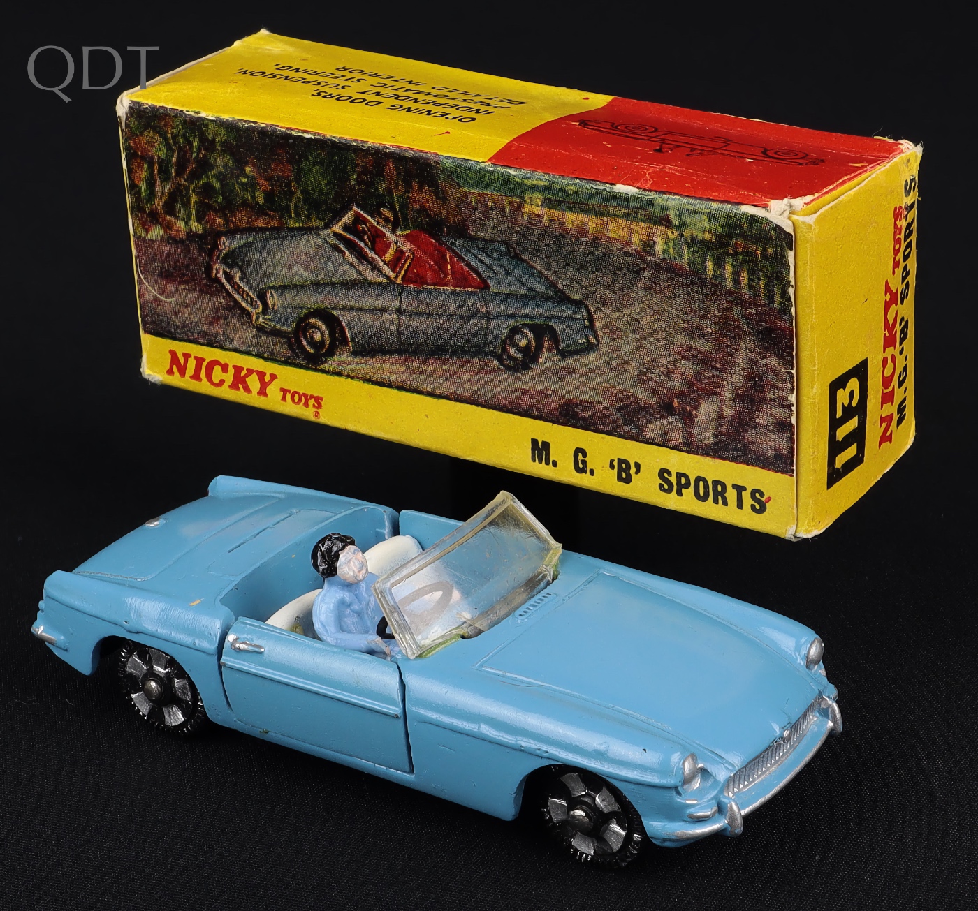 MGB Sports by Nicky Dinky Toys, No. 113. LIGHT SKY BLUE version with WHITE interior. Very, very near mint/boxed. Scarce. From The Phenomenal Collection. Starting bid £750. Please note that QDT apply 12.5% buyer's commission.