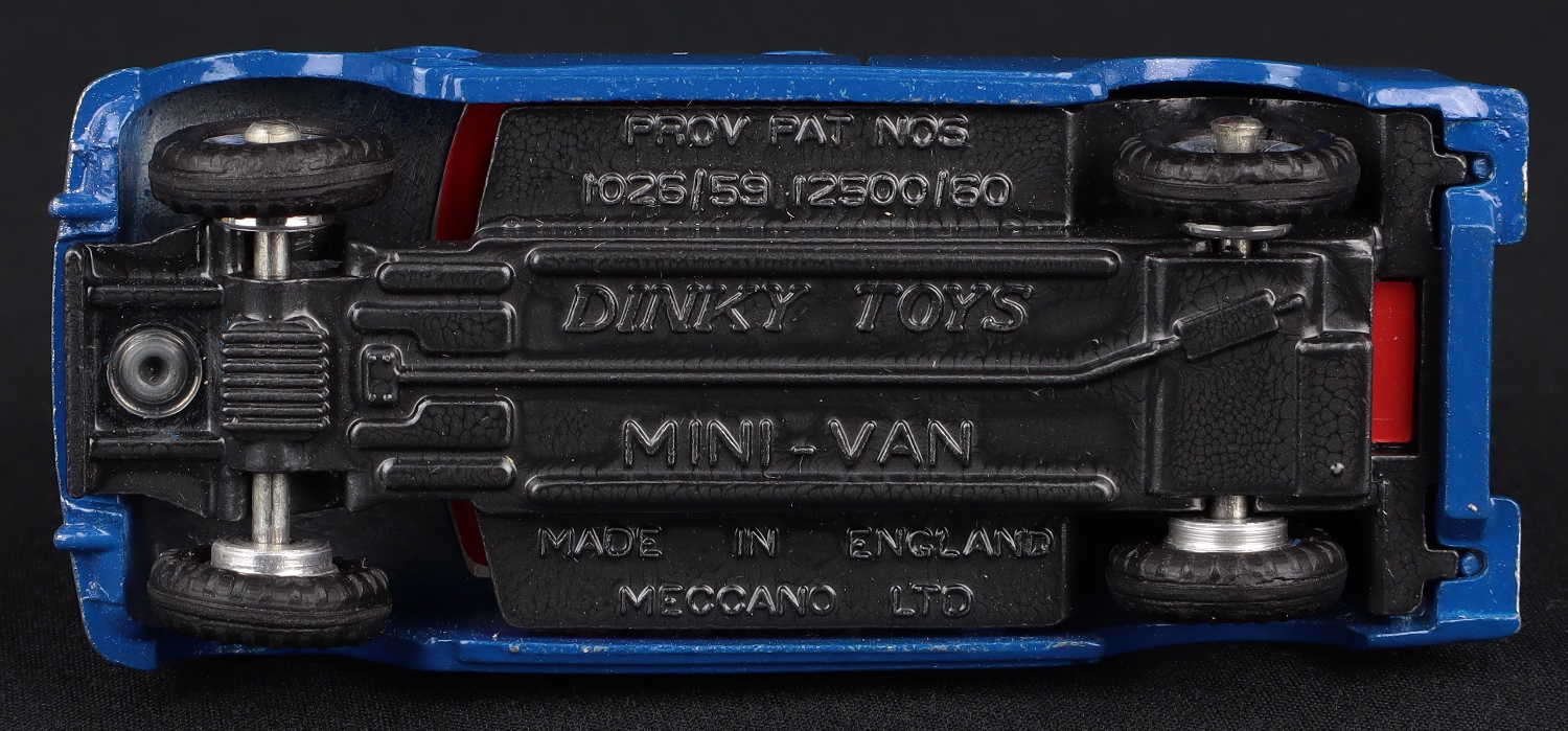 Issued between 1965-70, this Mini Van has a vibrant deep blue and white finish, red interior, bright shaped spun wheels with suspension, and a graphite grey base.