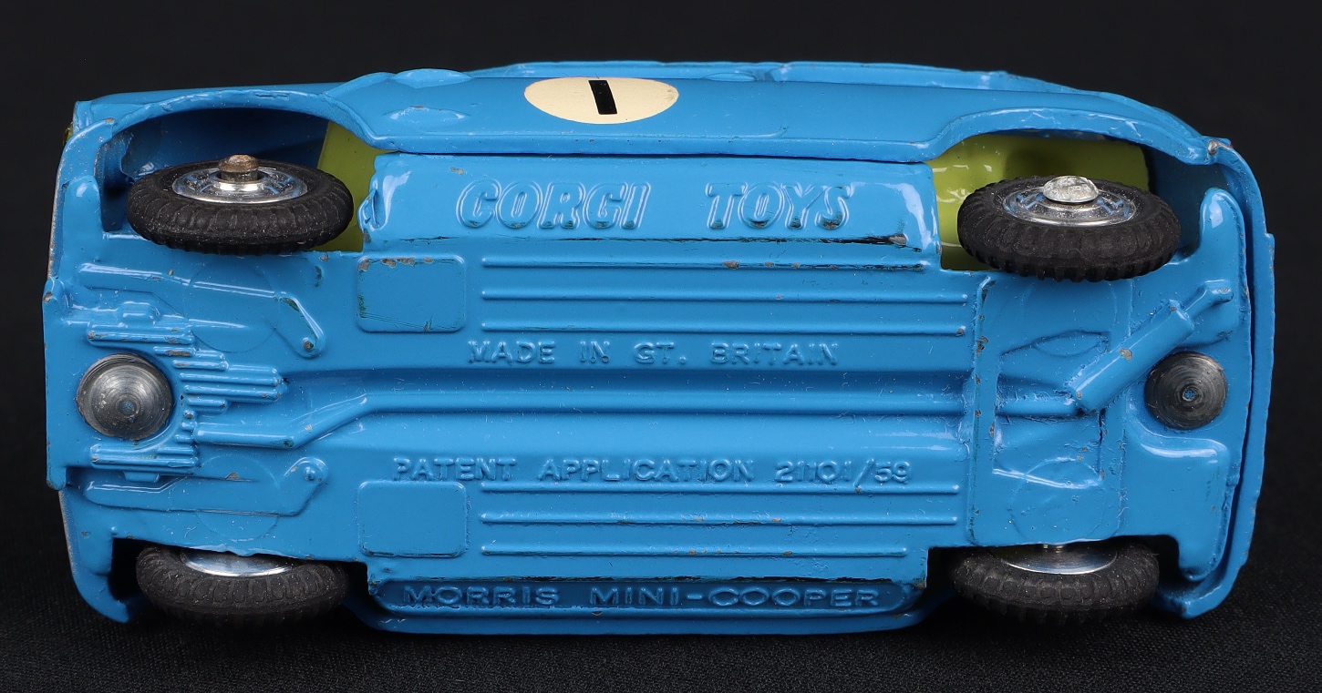 Morris Mini-Cooper Competition Model by Corgi Toys, No. 227. Very near mint/boxed. Deep mid-blue with white roof and bonnet issue. Scarce with YELLOW interior. Bold racing number 1. From The Elmer Collection. QDT starting bid £200. Please note that QDT apply 12.5% buyer's commission.