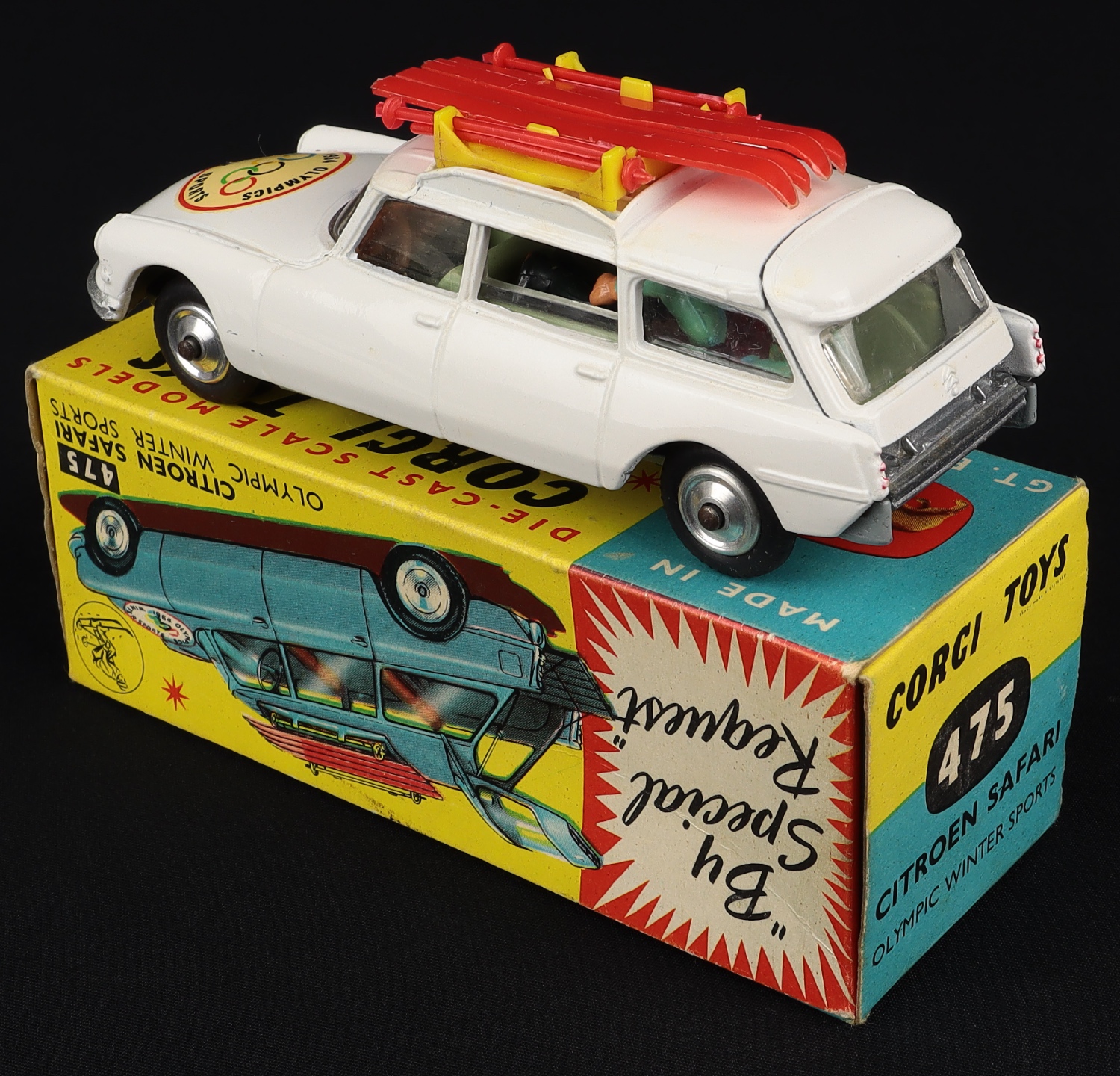 Citroen Safari '1964 Olympic Winter Sports' by Corgi Toys, No. 475. Red skis and poles version. Yellow roof rack. Very near mint/boxed with Ski-ing Figure & Leaflet. From The David Frank Collection.