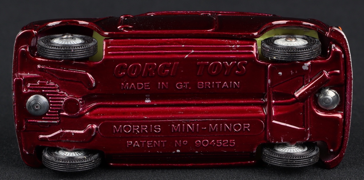 Morris Mini Minor by Corgi Toys, No. 226. Maroon version with cast wheels. Late issue base. Very near mint/boxed. Nice box! From The Reigate Collection.