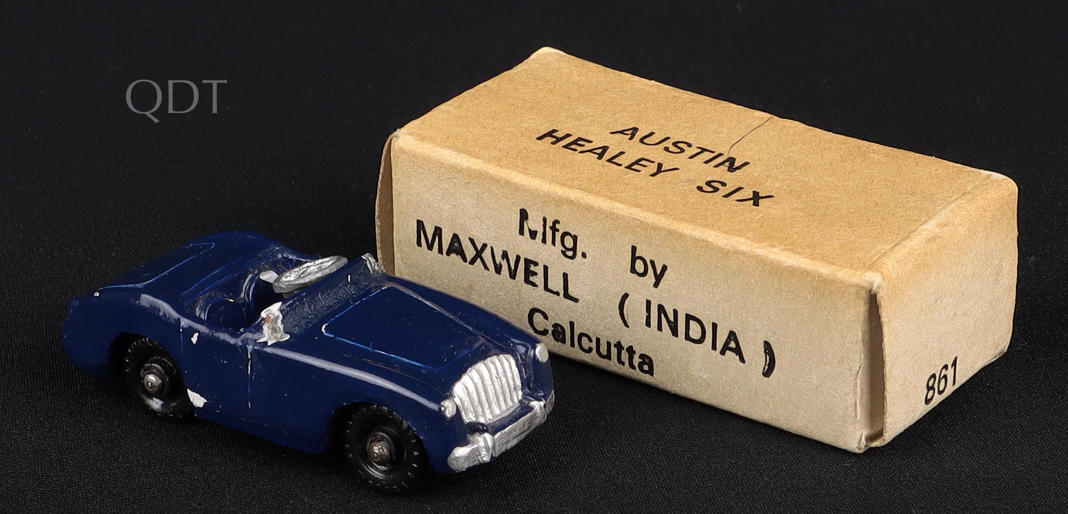 Austin Healey Six by Milton Models (Calcutta, India company), No. 861. Deep blue. Excellent plus/unboxed. Scarce issue using Schuco Piccolo Castings. Another First for QDT! From The 25 Year Collection in California. Starting bid £100. Please note that QDT apply 12.5% buyer's commission.