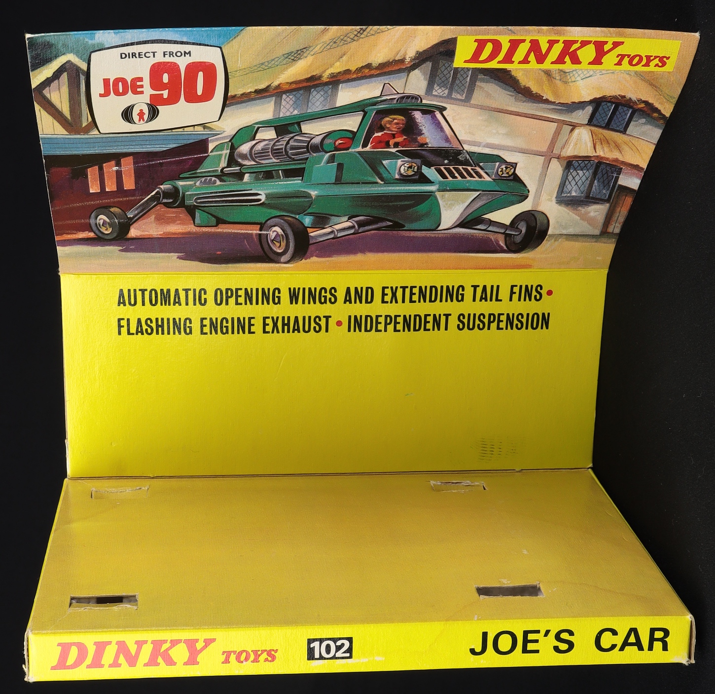Joe's Car (Gerry Anderson's Joe 90) by Dinky Toys, No. 102. Very near mint/boxed. With WORKING FLASHING LIGHT function. In pictorial card box. With Instruction Leaflet & polystyrene packing. From The Heart of England Collection. QDT starting bid £250. Please note that QDT apply 12.5% buyer's commission.