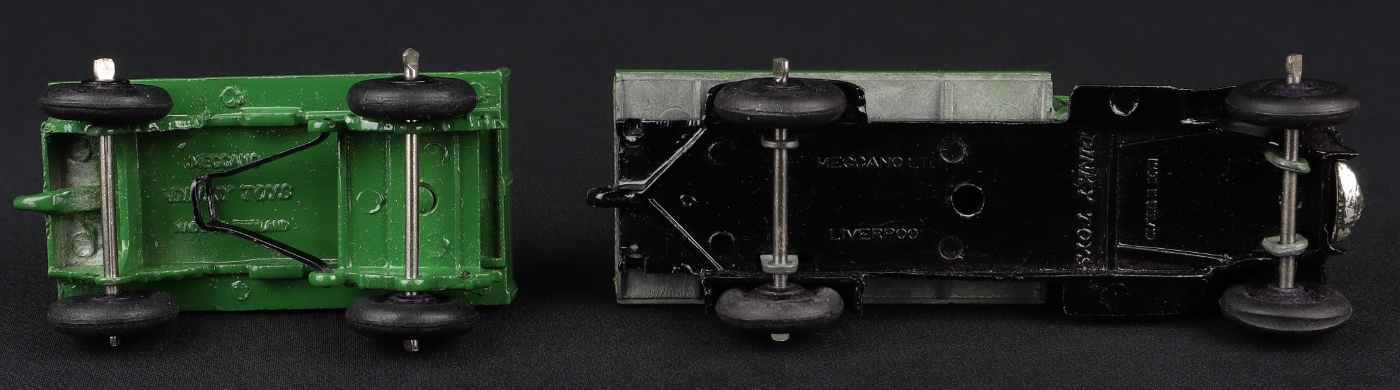 A pleasing early Dinky pairing issued 1945-47. . Type 3 issue Flat Truck in deep green with a black chassis comes with its matching 25G trailer (with black tinplate drawbar). Smooth original tyres are well-shaped. Tinplate headlight and radiator assembly with much of the plating still remaining. Intact cast tow bar.