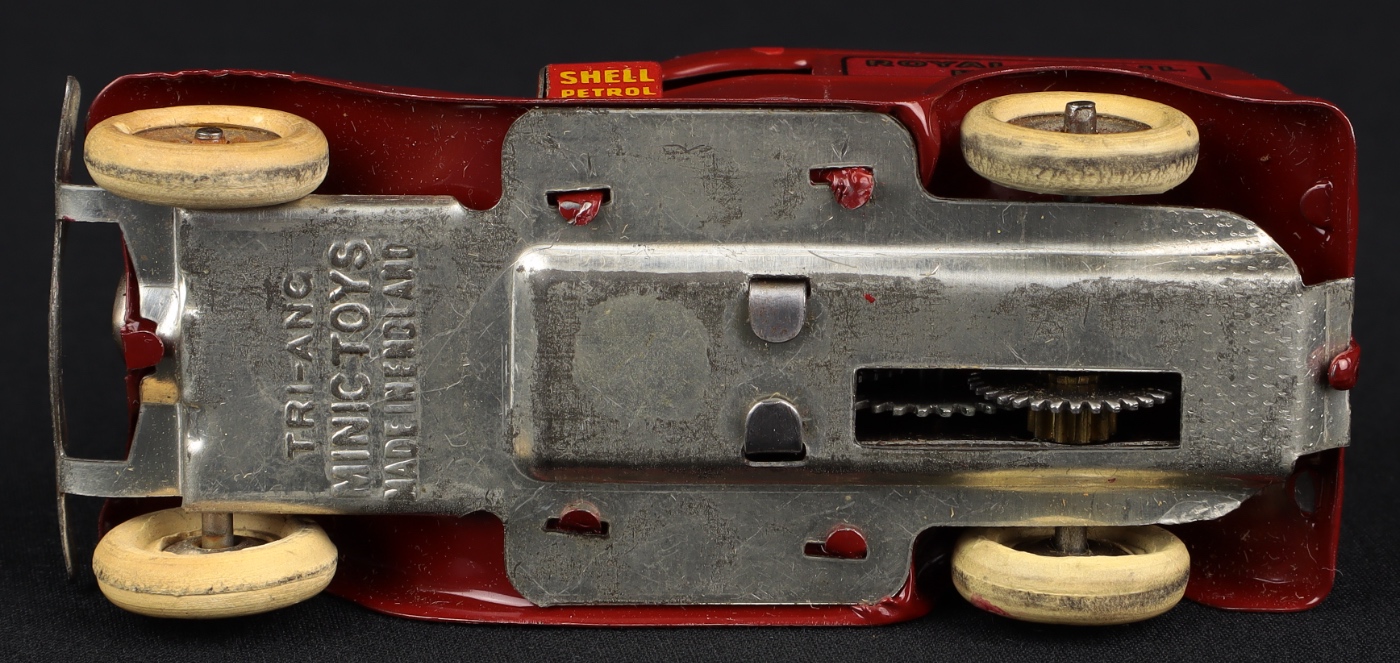 Early issue in deep red-brown with ‘E.R.’ lettering and crest at the sides. Impressive example with all delicate parts complete, including the transfers at the sides and rear. Delightful little Shell Petrol fuel tank at the side, original white tyres. Bright metal parts and a working clockwork motor.