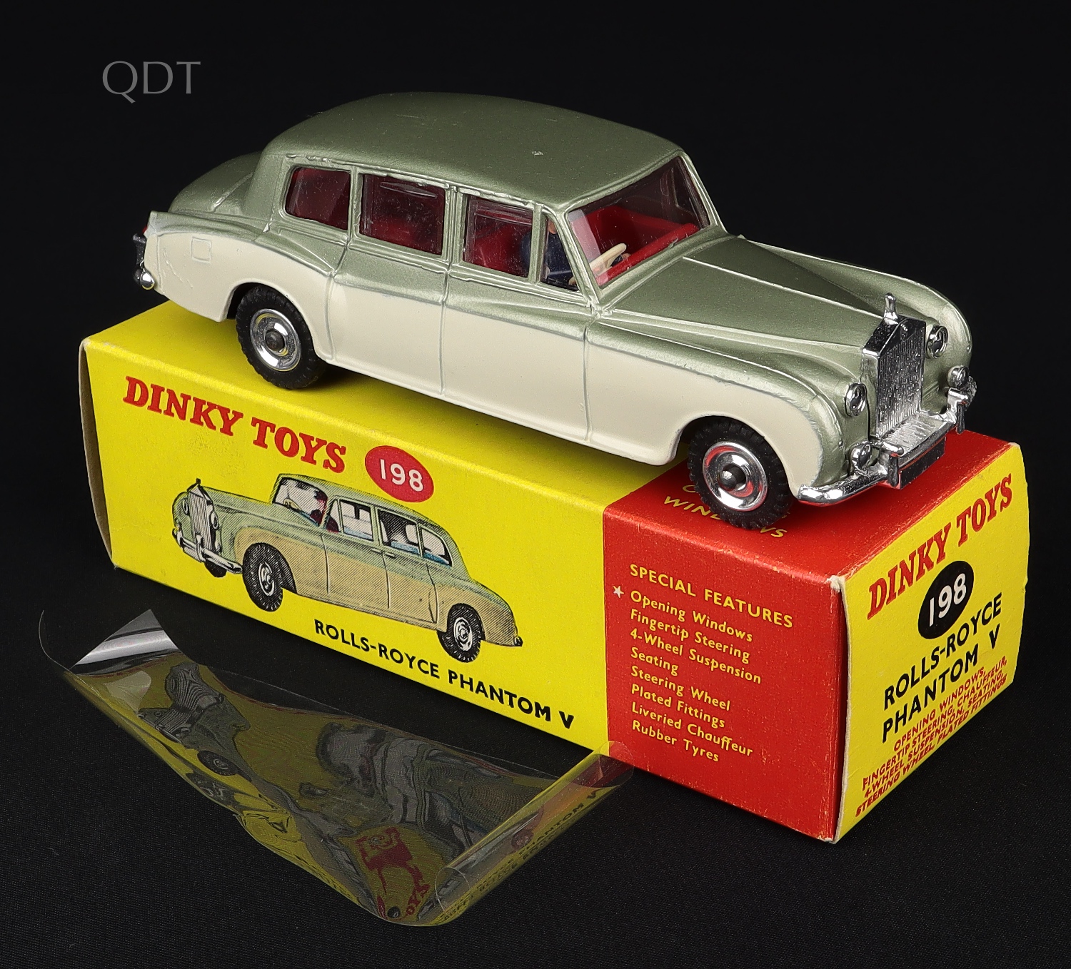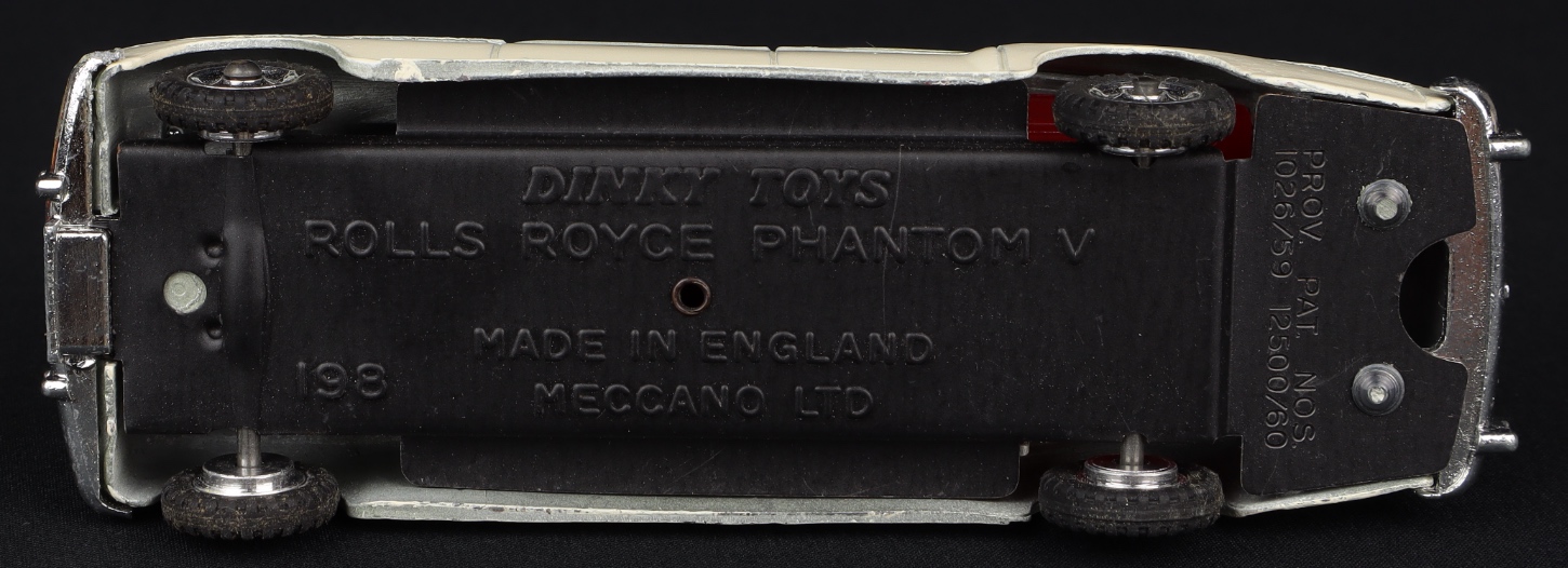 Dinky 198 Rolls-Royce Phantom V. Very near mint/boxed, with thin clear plastic packing strip. Issue with RED interior. With intact bonnet emblem. MATTE baseplate. From The Rickman Collection.