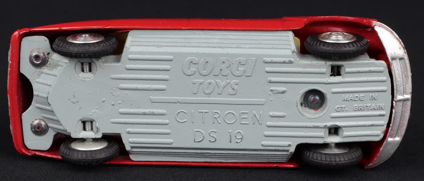 Citroen DS 19 by Corgi Toys, No. 210S. Near mint plus/boxed. Crimson (not scarlet) red, shaped spun wheels issue. From The Elmer Collection.