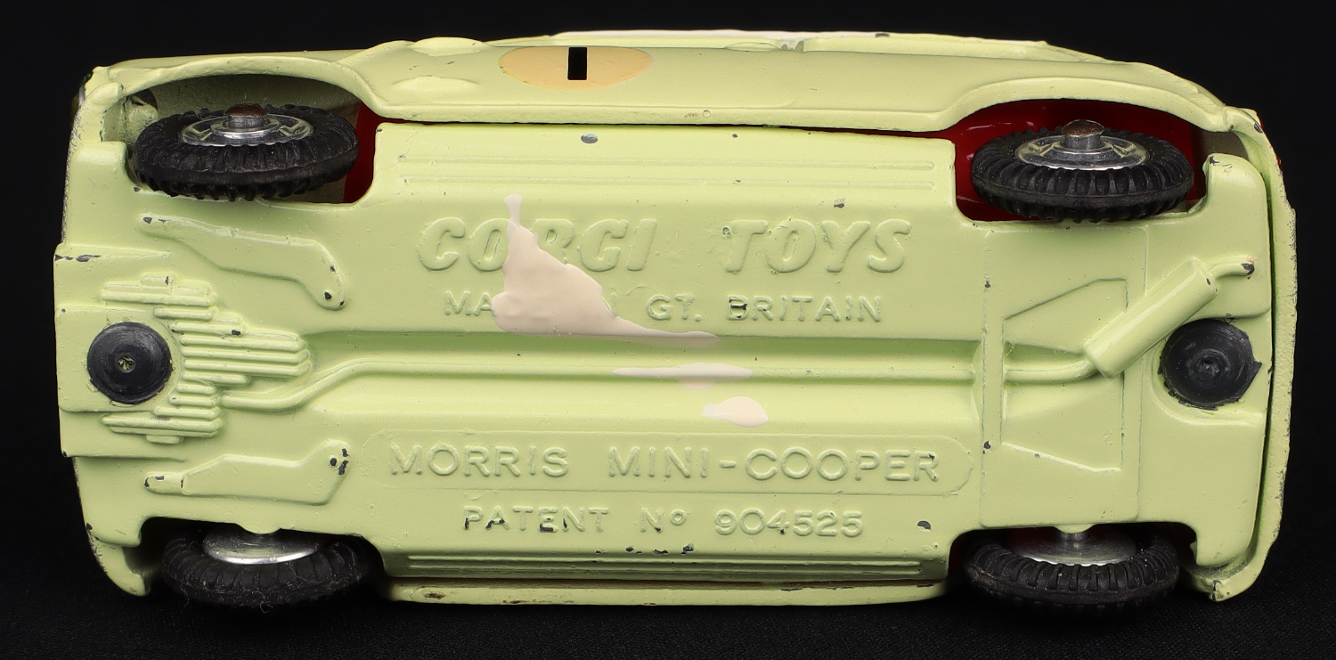 Morris Mini-Cooper Competition Model by Corgi Toys, No. 227. Lemon with white bonnet. Racing number 1. Very near mint /boxed. From The Elmer Collection. Starting bid £200. Please note that QDT apply 12.5% buyer's commission.