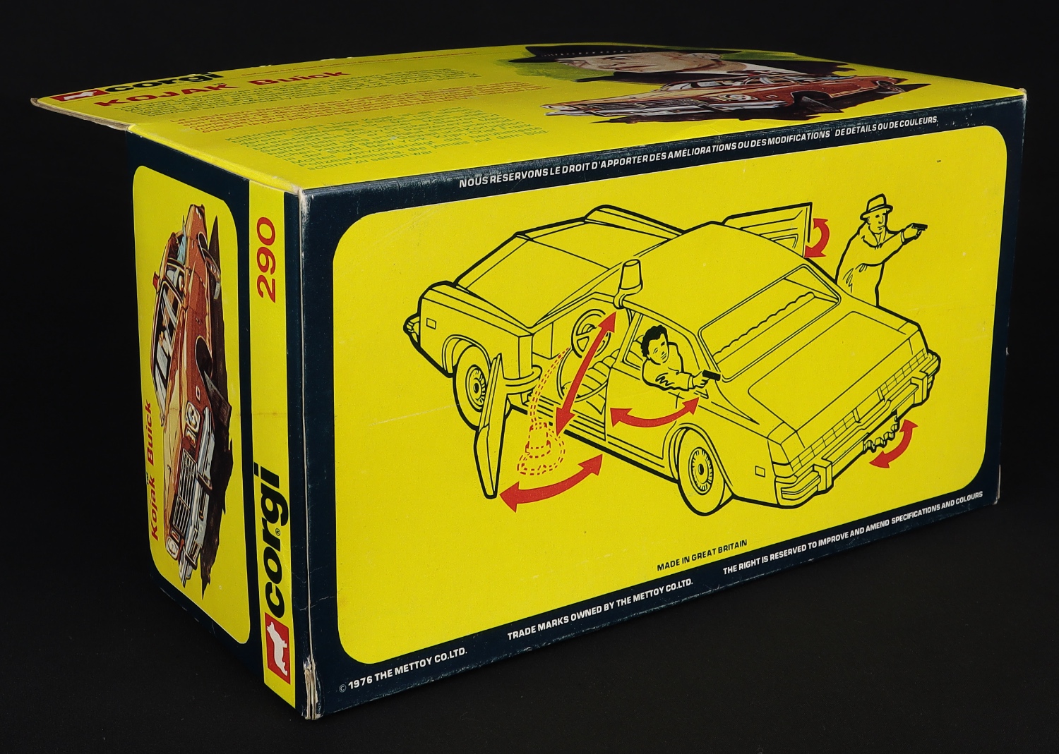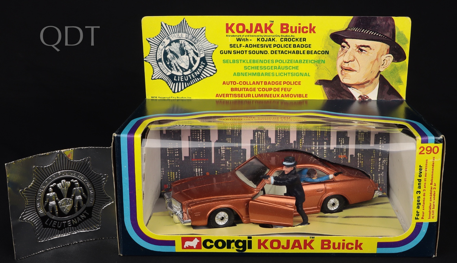 Kojak Buick by Corgi Toys, No. 290. Bright metallic mid-bronze issue. 2nd issue from 1976. Very, very near mint/boxed. With both figures of Kojak & Crocker. Badge. From The Elmer Collection.