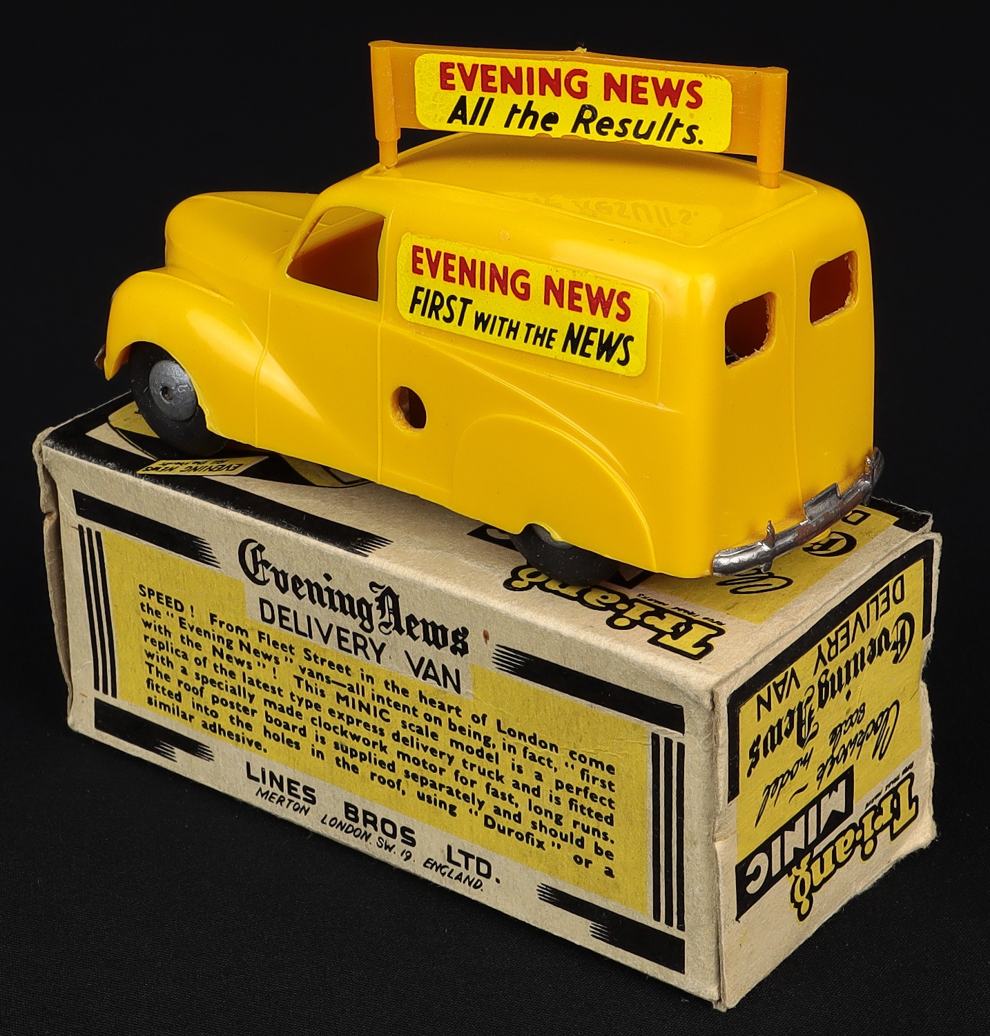 Austin A 40 Delivery Van 'EVENING NEWS' by Minic models, No 3124. Very near mint (tarnished bumper in places) /boxed. With original MINIC Key. From The Denis Tyler Collection. Starting bid £50. Please note that QDT apply 12.5% buyer's commission.