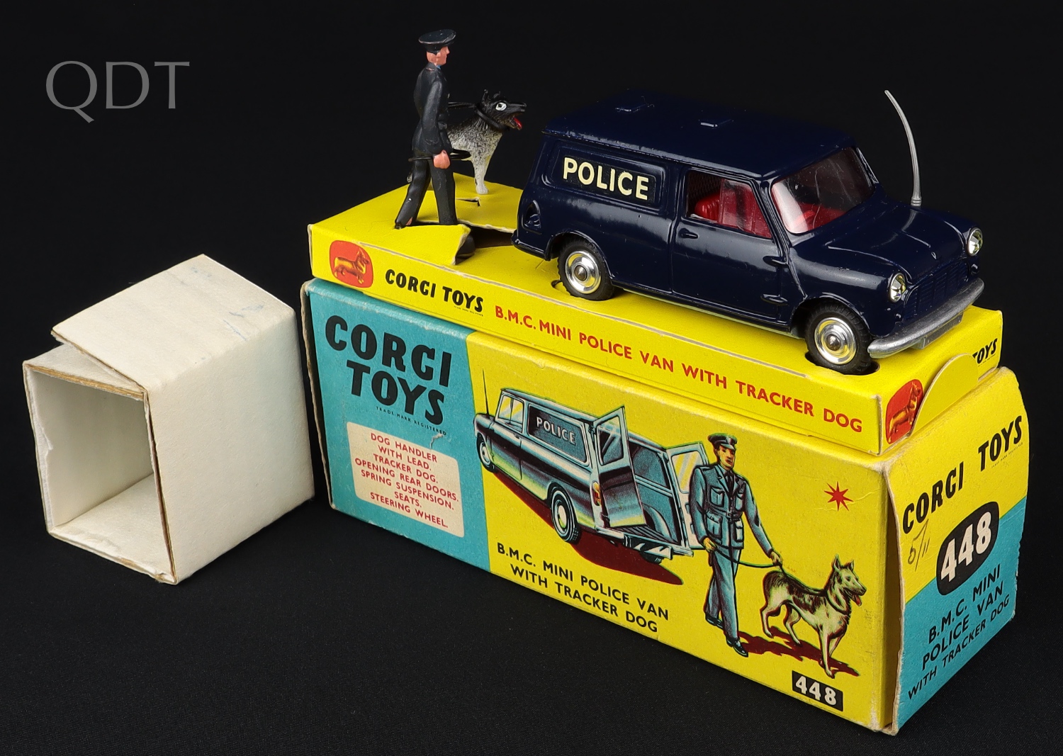 B.M.C. Mini Police Van with Tracker Dog by Corgi Toys, No. 448. Spun wheels. Scarce version with a 'simpler' card plinth. Very near mint/boxed, with packing piece. From Boris's Collection.
