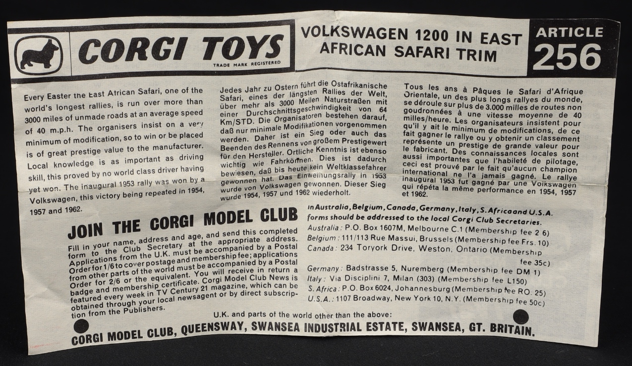 Volkswagen 1200 in East African Safari Trim with Rhino by Corgi Toys, No. 256. Very near mint/boxed. Left-hand drive. With all packing, leaflet & circular card ring. From Boris's Collection.