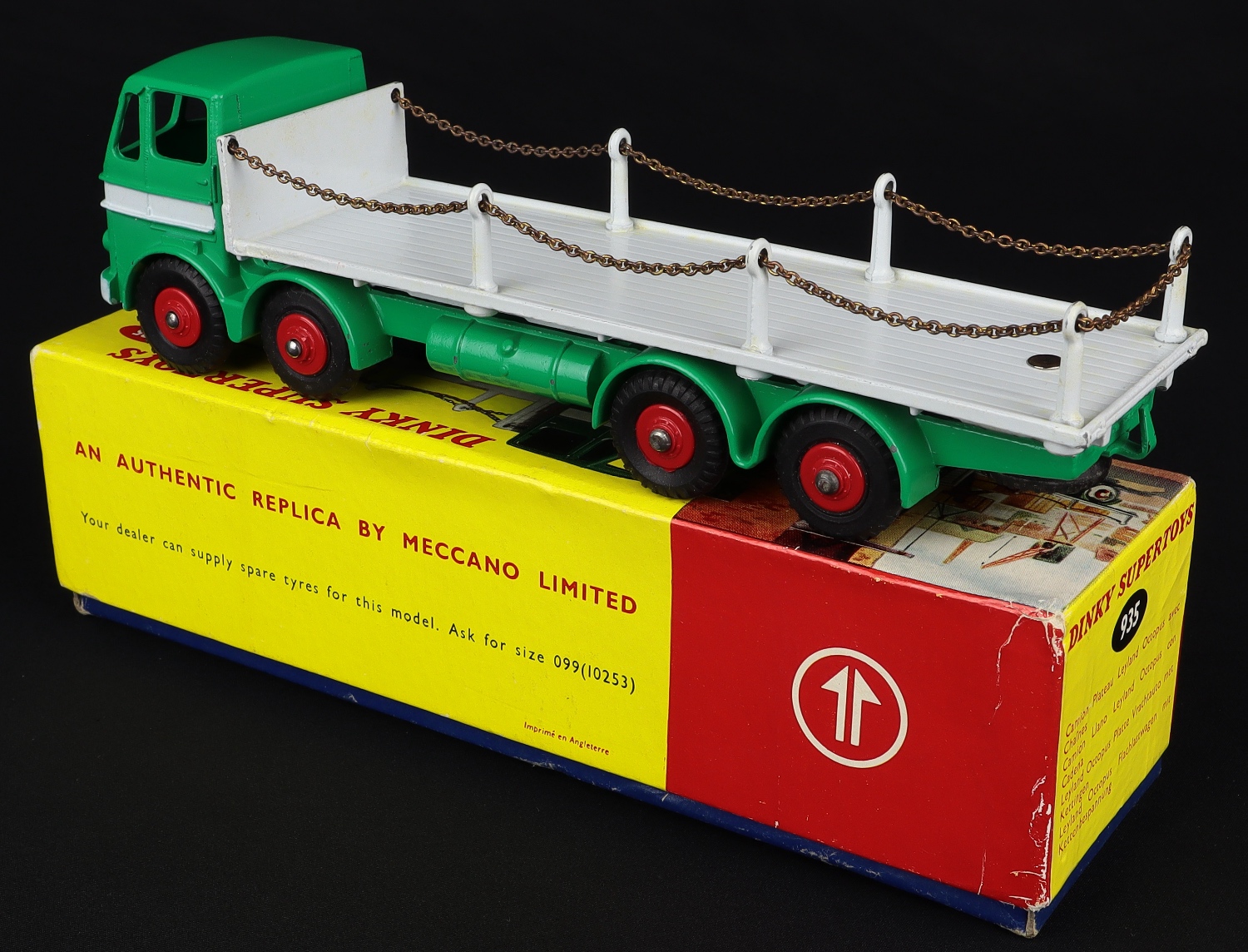 Leyland Octopus Flat Truck with chains by Dinky Toys, No. 935. Scarce green and pale grey version. Very near mint /boxed. From The Rickman Collection.