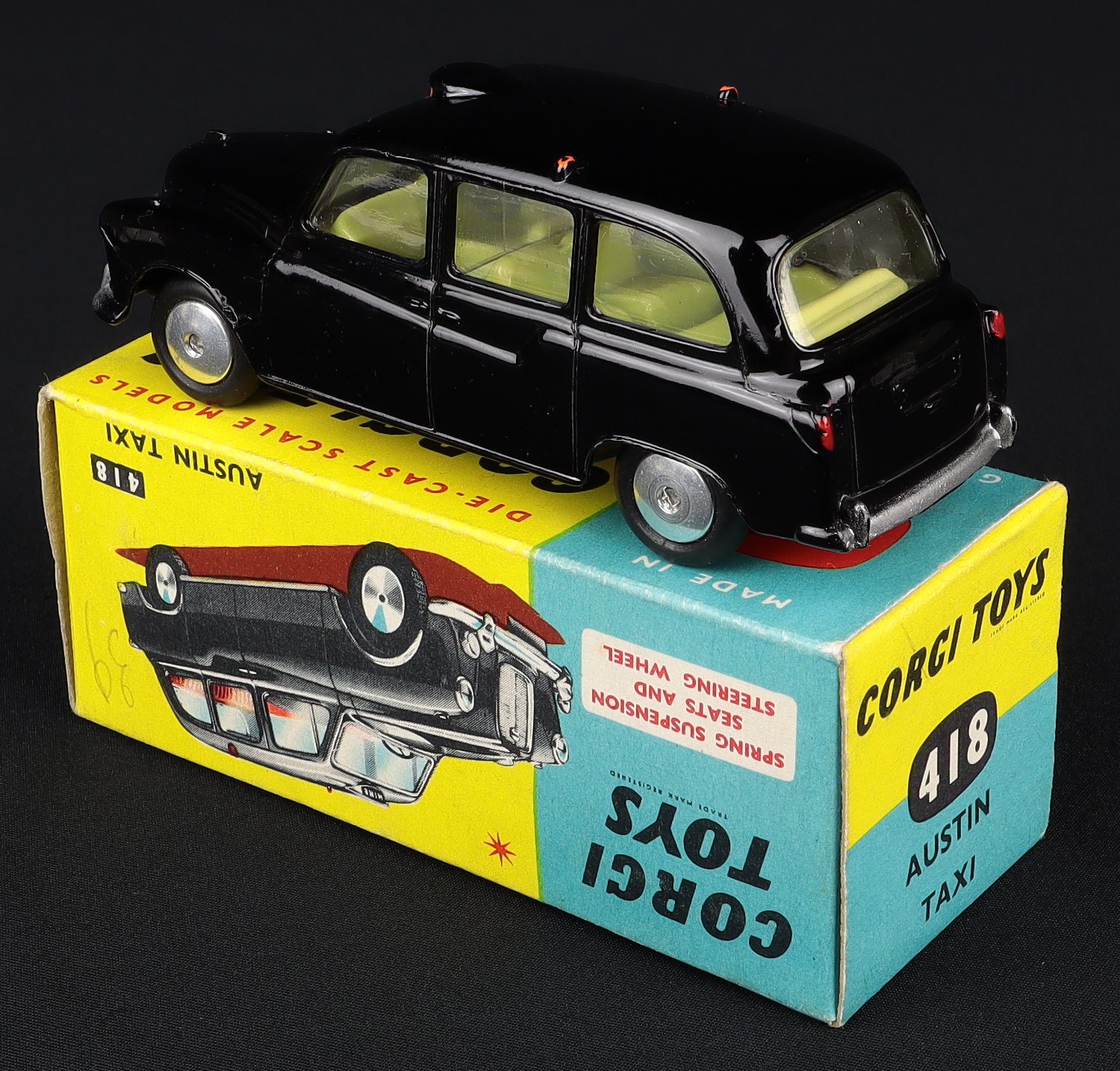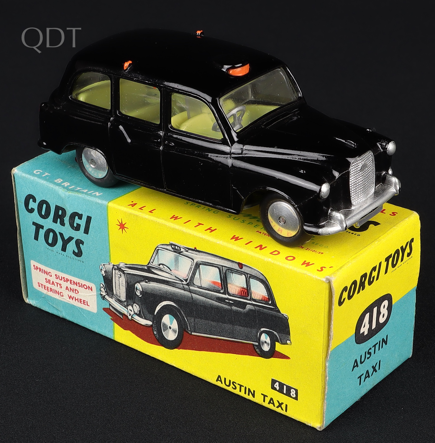 Austin Taxi by Corgi Toys, No. 418. Black with FLAT SPUN wheels. Very, very near mint/boxed. From The Elmer Collection.