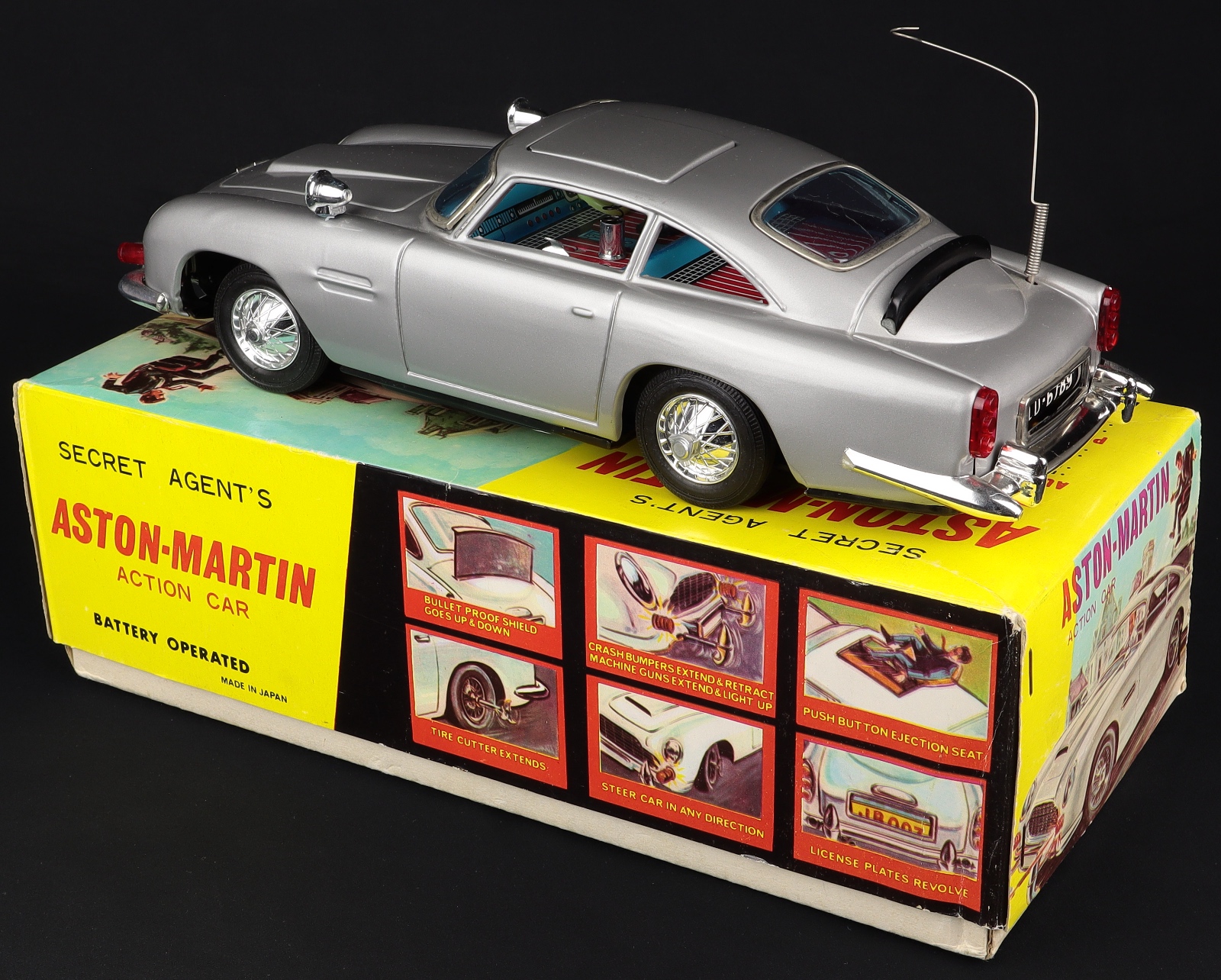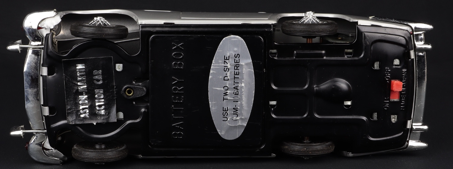 James Bond's Aston Martin DB5 by Gilbert Toys, No. 16701. Sensational Japanese tinplate model. Rare UNLICENSED BOX Version - A First for QDT! With battery-operated functions. With James Bond figure & villain - in still-sealed packet. Very near mint/boxed. Starting bid £500. Please note that QDT apply 12.5% buyer's commission.