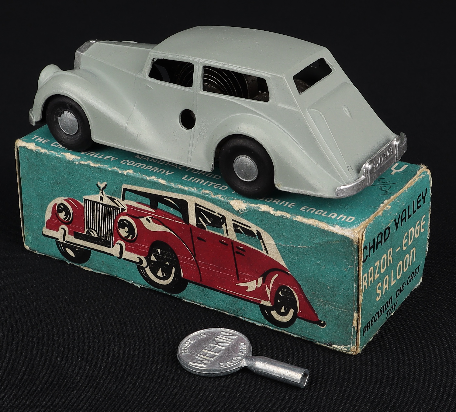 Razor-Edge Saloon by Chad Valley (Wee-Kin). GREY version. Very near mint/boxed. Working clockwork function with original key & INSPECTION NOTE . Scarce model from The Denis Tyler Collection. Starting bid £100. Please note that QDT apply 12.5% buyer's commission.