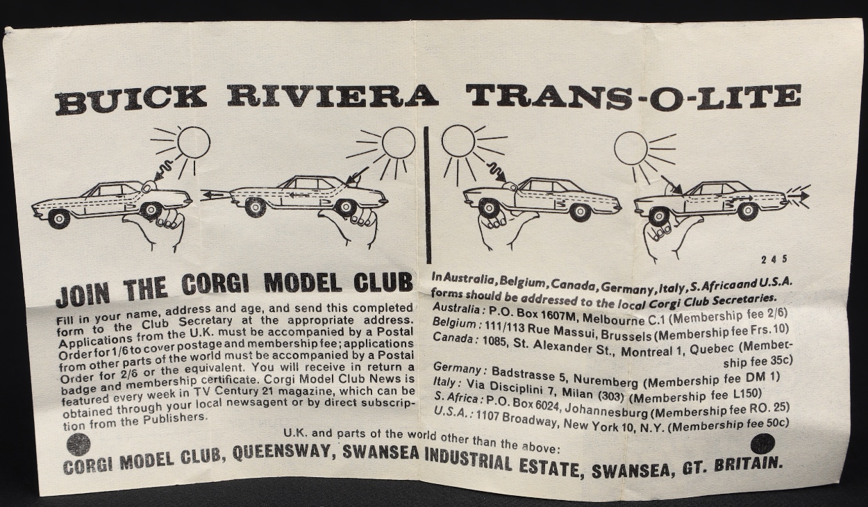 Corgi Club Membership Form and on the reverse is the model-specific information relating to the trans-o-lite function.