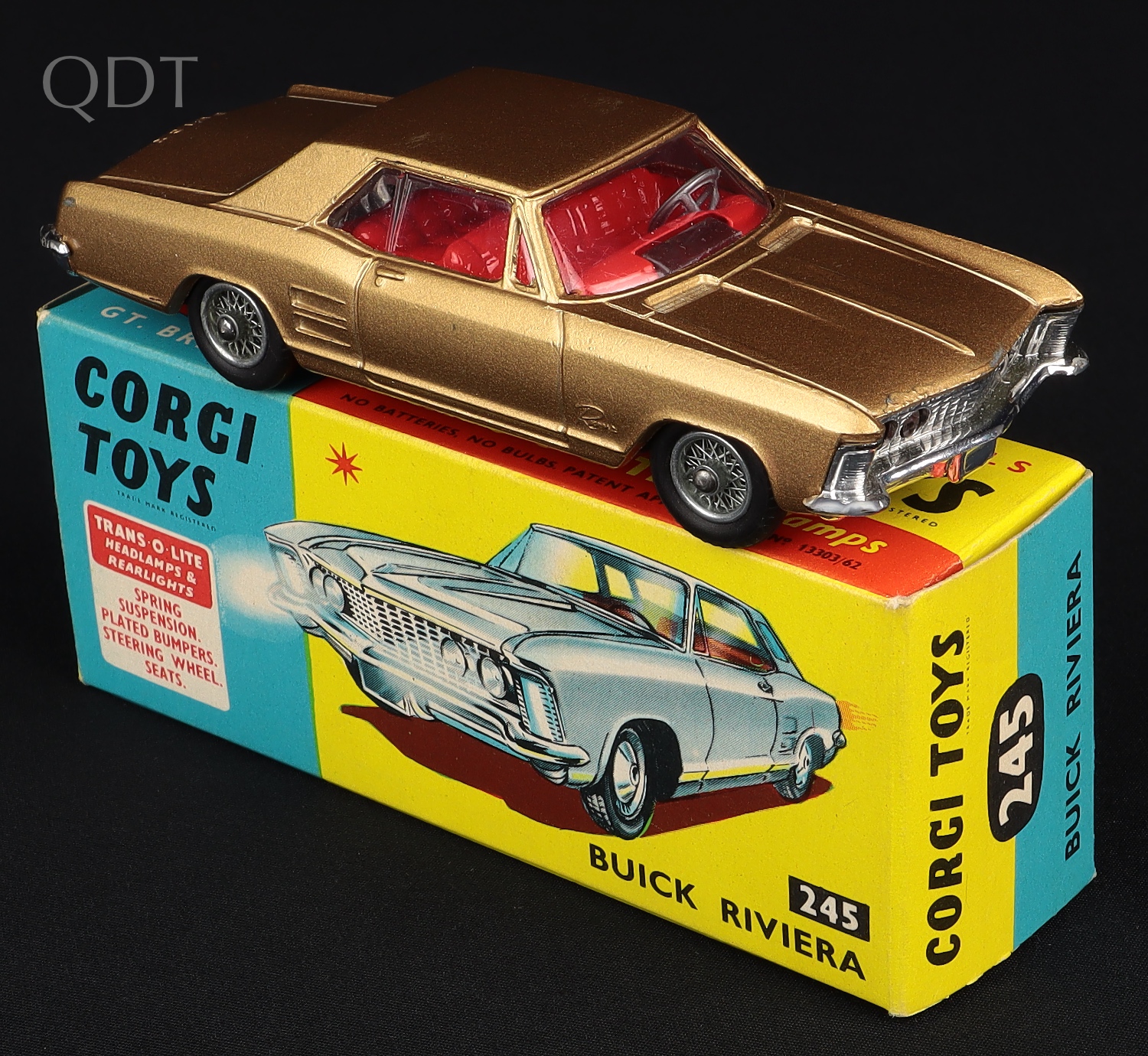 Buick Riviera by Corgi Toys, No. 245. Gold issue, spoked wheels. Very near mint/boxed, with model specific leaflet. Nice box! From The Elmer Collection.