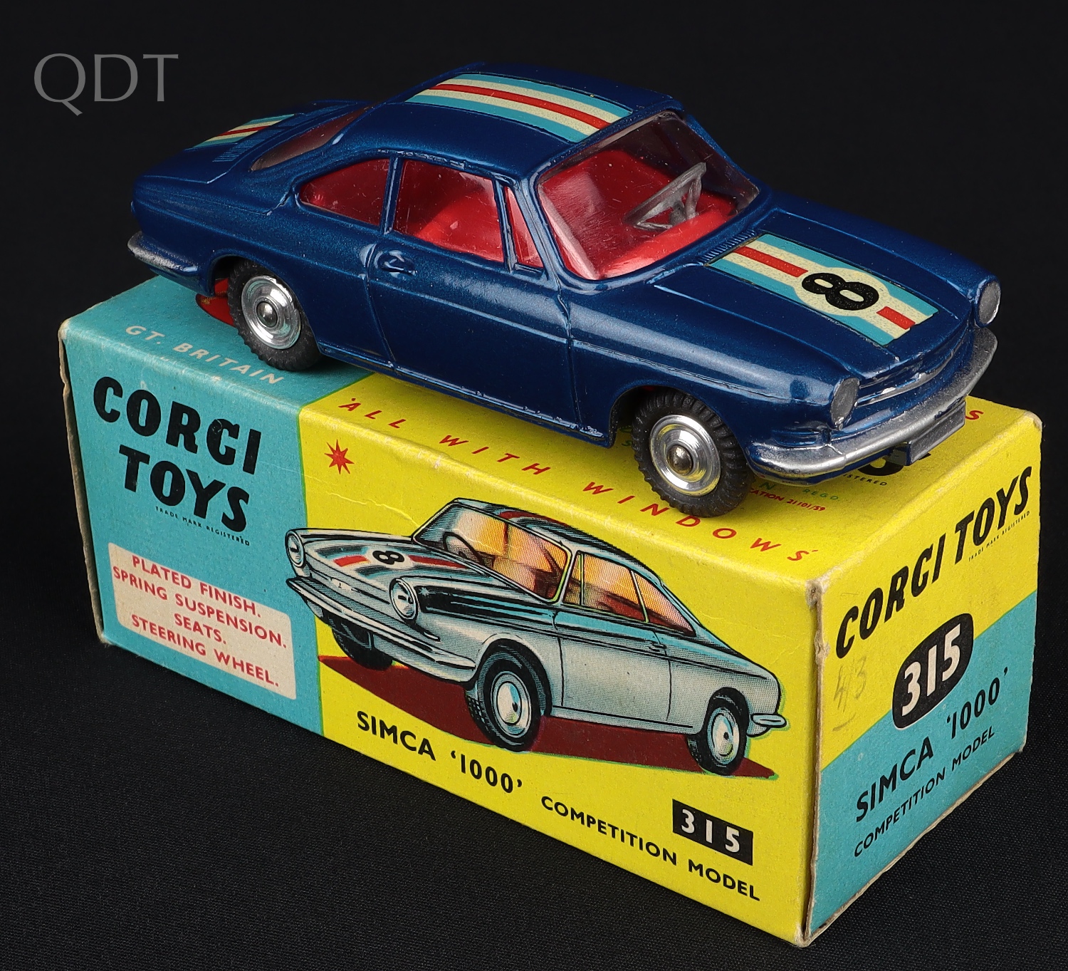 Simca 1000 Competition Model by Corgi Toys, No. 315. Hard to find version in deep metallic blue. Very near mint/boxed. A rare find from The Elmer Collection.