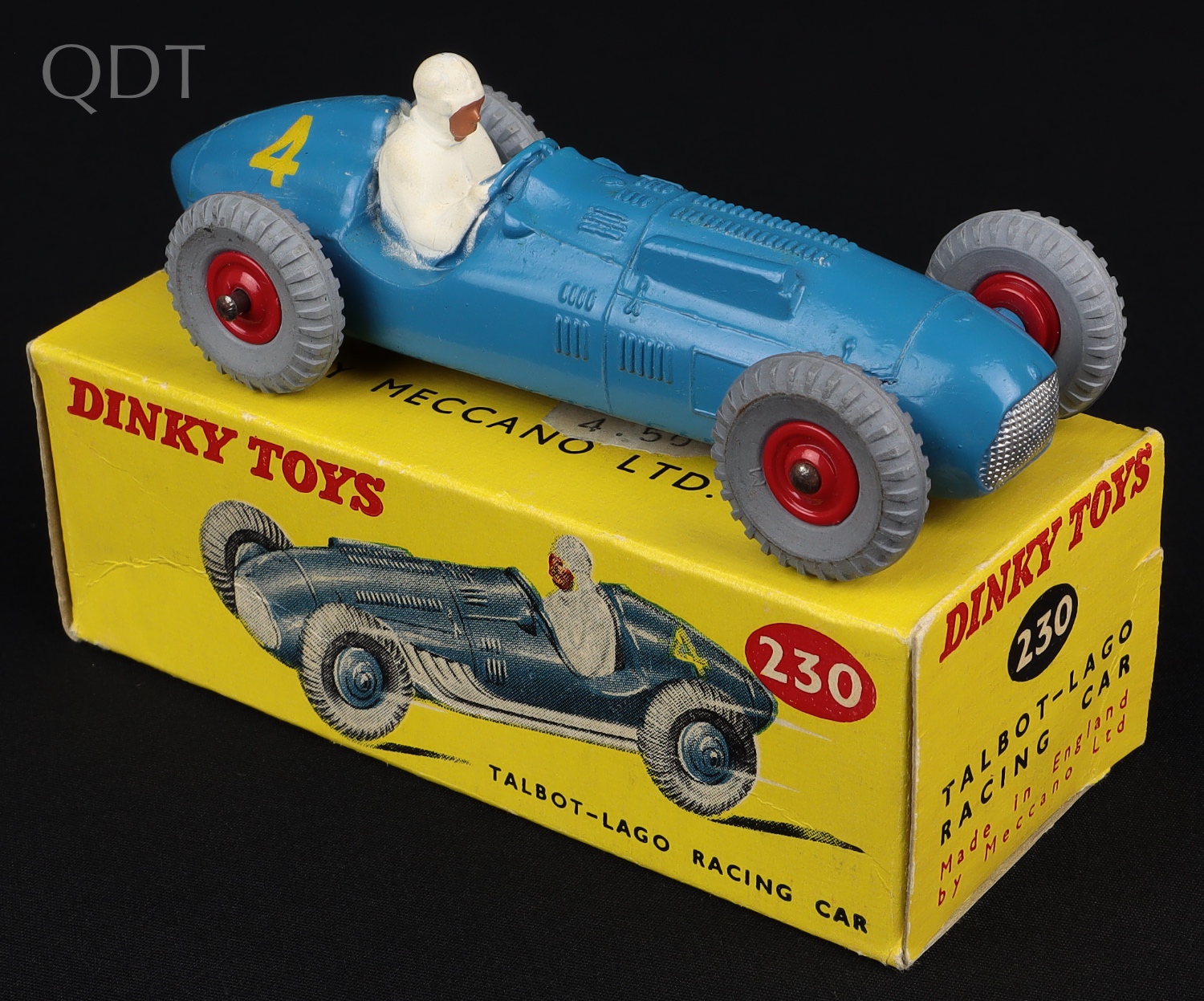 Talbot Lago Racing Car by Dinky Toys, No. 230. Very, very near mint/boxed. Scarce with RED PLASTIC wheels. Correct later picture box. From The Rickman Collection. Starting bid £200. Please note that QDT apply 12.5% buyer's commission.