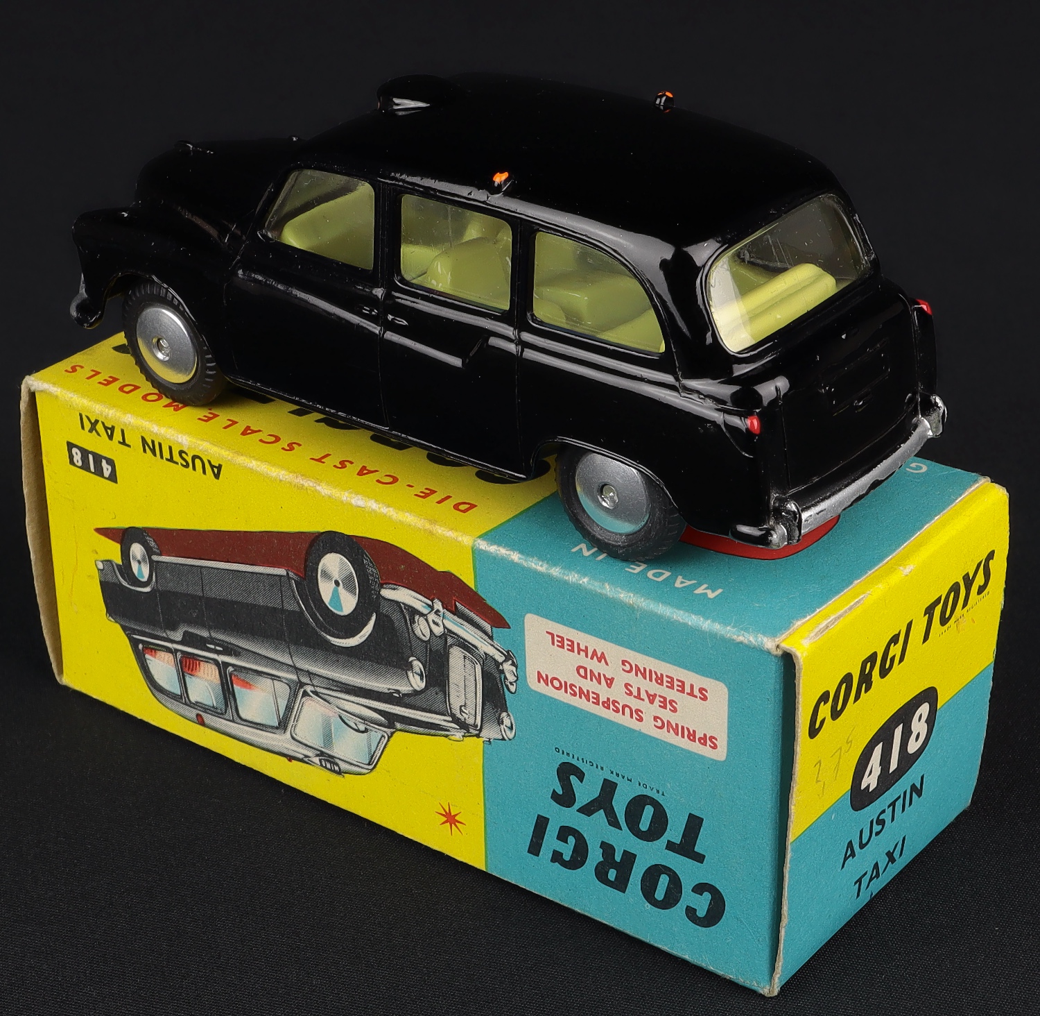 Austin Taxi by Corgi Toys, No. 418. Black with FLAT SPUN wheels. Very near mint/boxed.