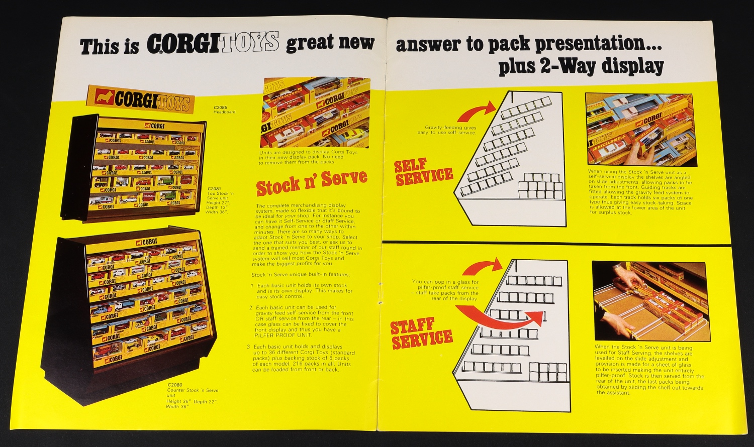 This engrossing magazine provides a little window into the world of the Corgi shopkeeper back in the day and provides us with an insight into the remarkable choice of display cabinets and promotional material available at the time, including signs, Corgi cabinets, card displays & tinplate shelving. Dazzling array of Corgi Rocket & Corgi Junior Stands as well!
