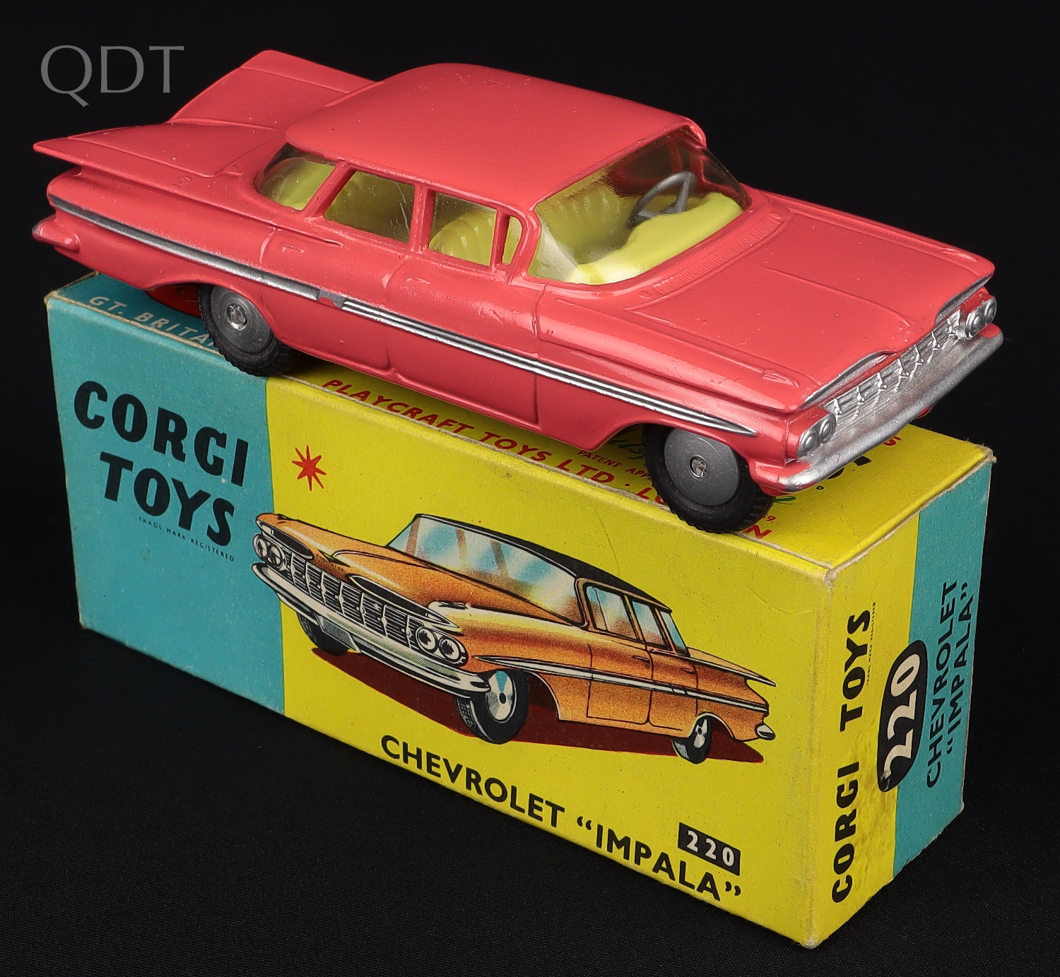 Chevrolet Impala by Corgi Toys, No.220. Salmon pink issue with FLAT SPUN wheels. Very near mint/boxed From The Elmer Collection.