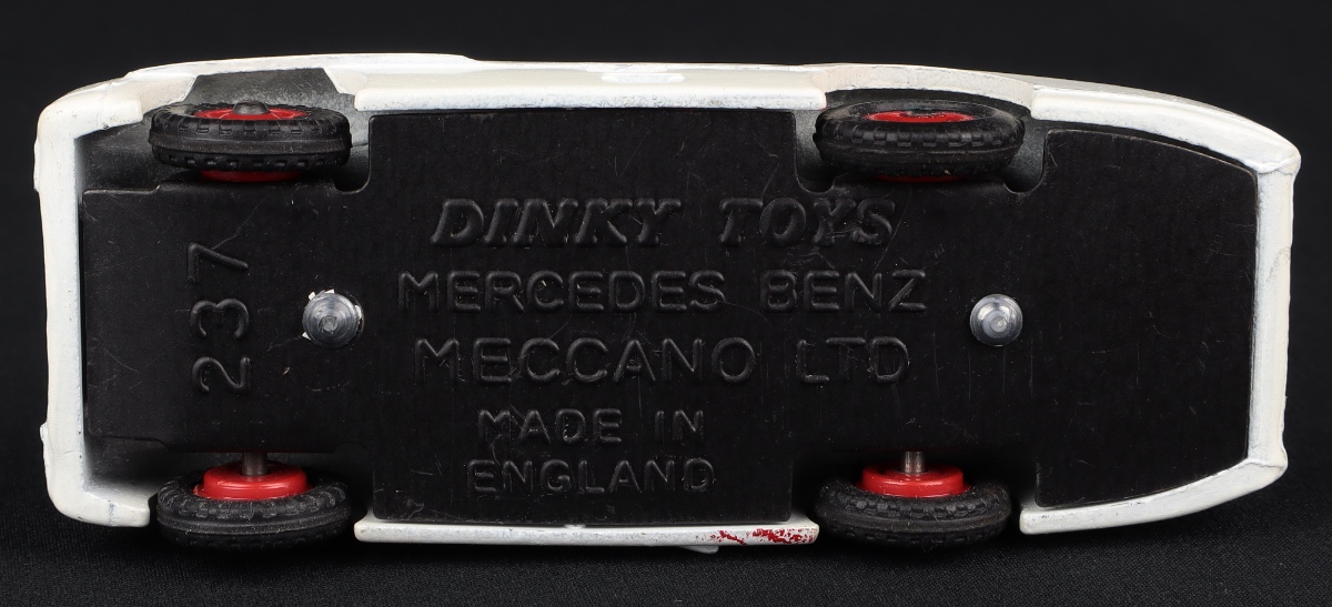Mercedes Benz Racing Car by Dinky Toys No. 237. Scarce late version. Matt white, red plastic wheels, blue metal driver, plastic steering wheel. Interesting transition issue. Very, very near mint/boxed.