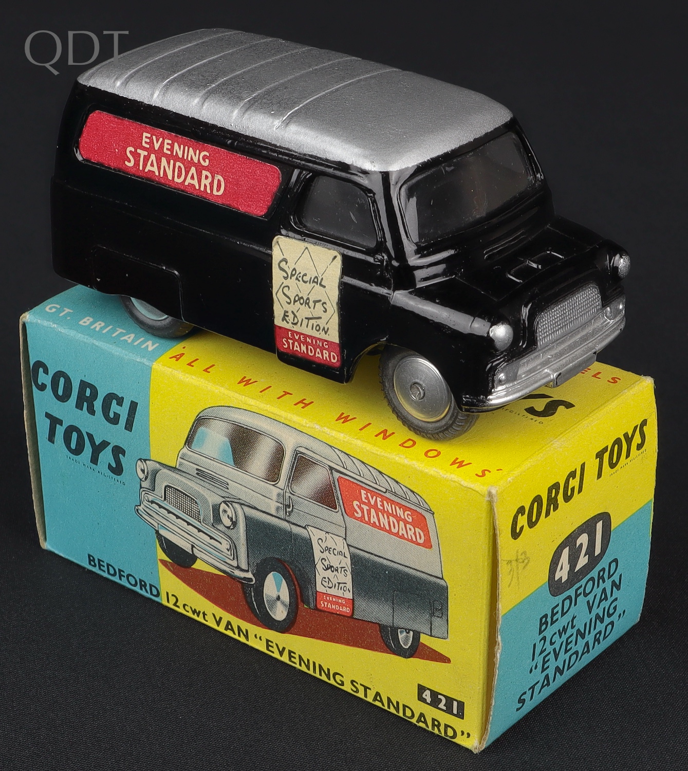 Bedford 12CWT Van "Evening Standard" by Corgi Toys, No. 421. Very near mint/boxed. Black issue with a silver roof. Scarce.