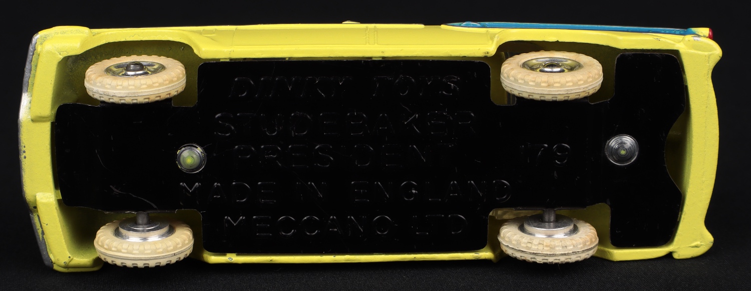 Studebaker President Sedan by Dinky Toys, No. 179. Very near mint/boxed. Yellow & blue issue. Spun wheels. Scarce. From The Rickman Collection.