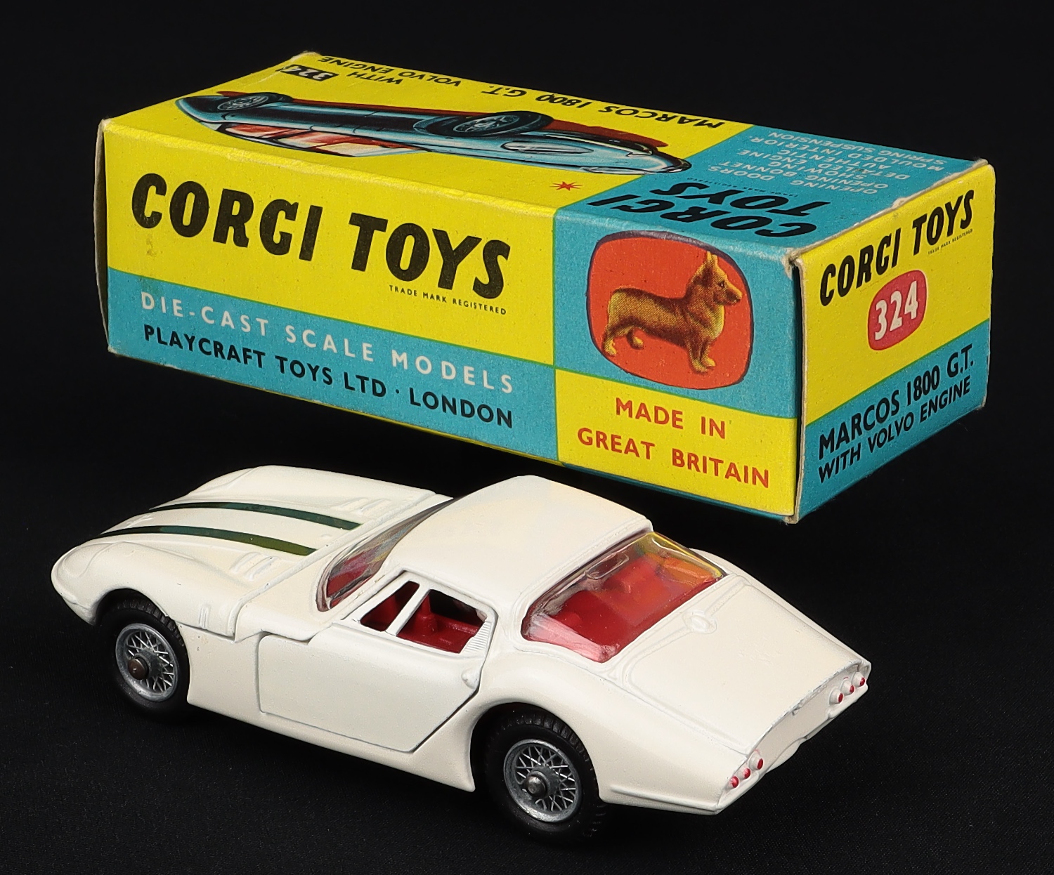 Marcos 1800 G.T. with Volvo engine by Corgi Toys, No. 324. Very near mint/boxed. With unapplied racing numbers. From The Elmer Collection.