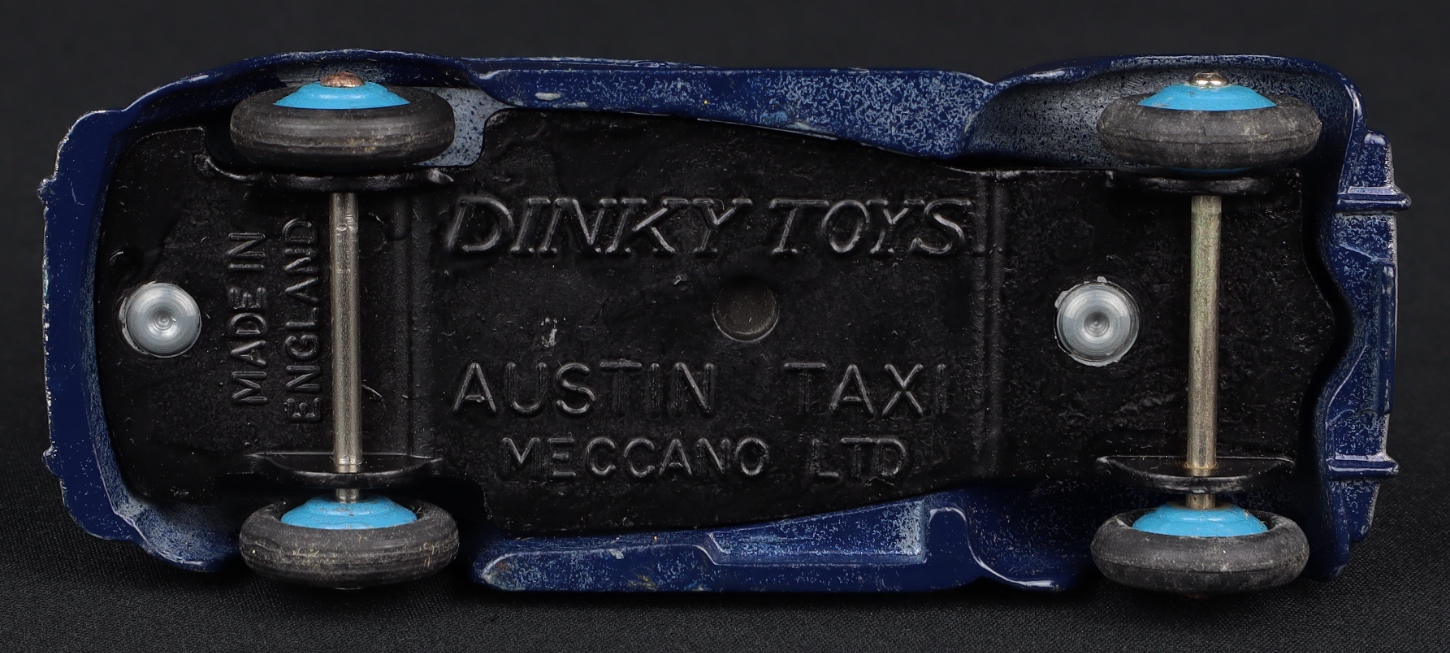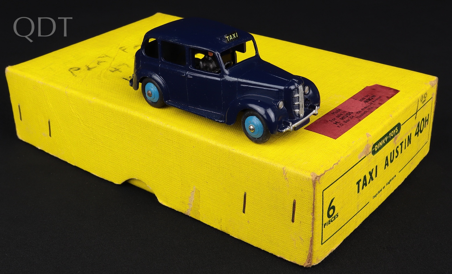 Austin Taxi by Dinky Toys, No. 40H in Trade Box, with dividers. Very near mint/boxed. Scarce version in dark blue from The Reference Collection. Starting bid £150. Please note that QDT apply 12.5% buyer's commission.