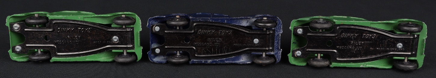 3 x Riley Saloons by Dinky Toys, No. 40A. Very scarce issue in MIDNIGHT BLUE. Also mid-green & deep green versions . Near mint plus - very near mint/not boxed individually. From The Reference Collection. Starting bid £150. Please note that QDT apply 12.5% buyer's commission.