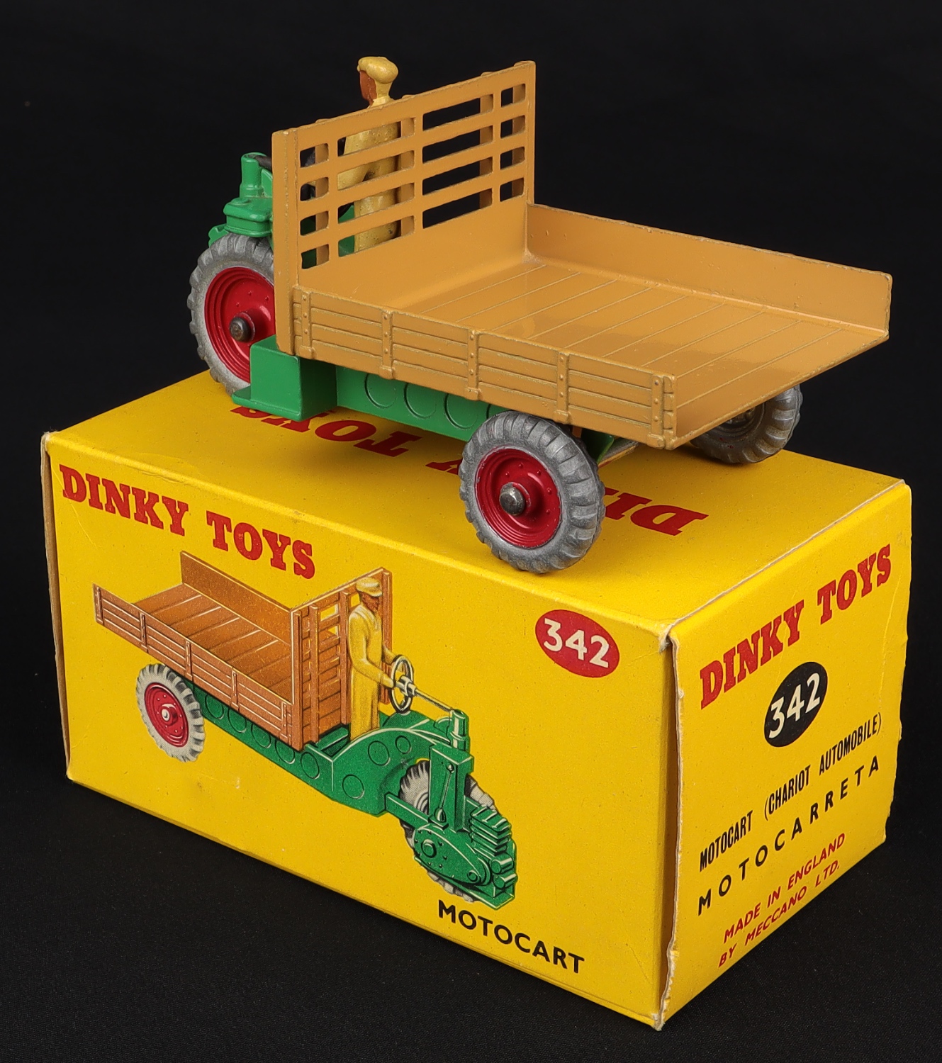 This later numbering of the classic Dinky Motocart (1954-61) is a very fine unused example finished in mid-green and mid tan with red wheels and the familiar metal light tan workman figure behind the wheel.