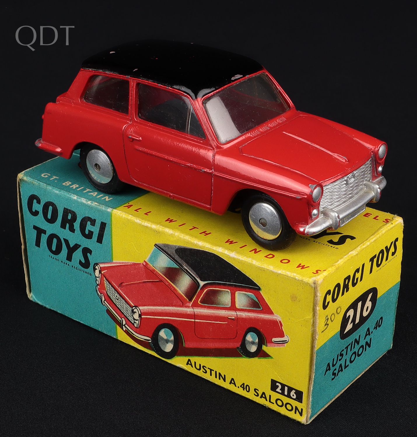 Austin A40 by Corgi Toys, No. 216. Near mint/boxed. Scarce red and black NON-MECHANICAL issue with flat spun wheels. From The Rickman Collection.