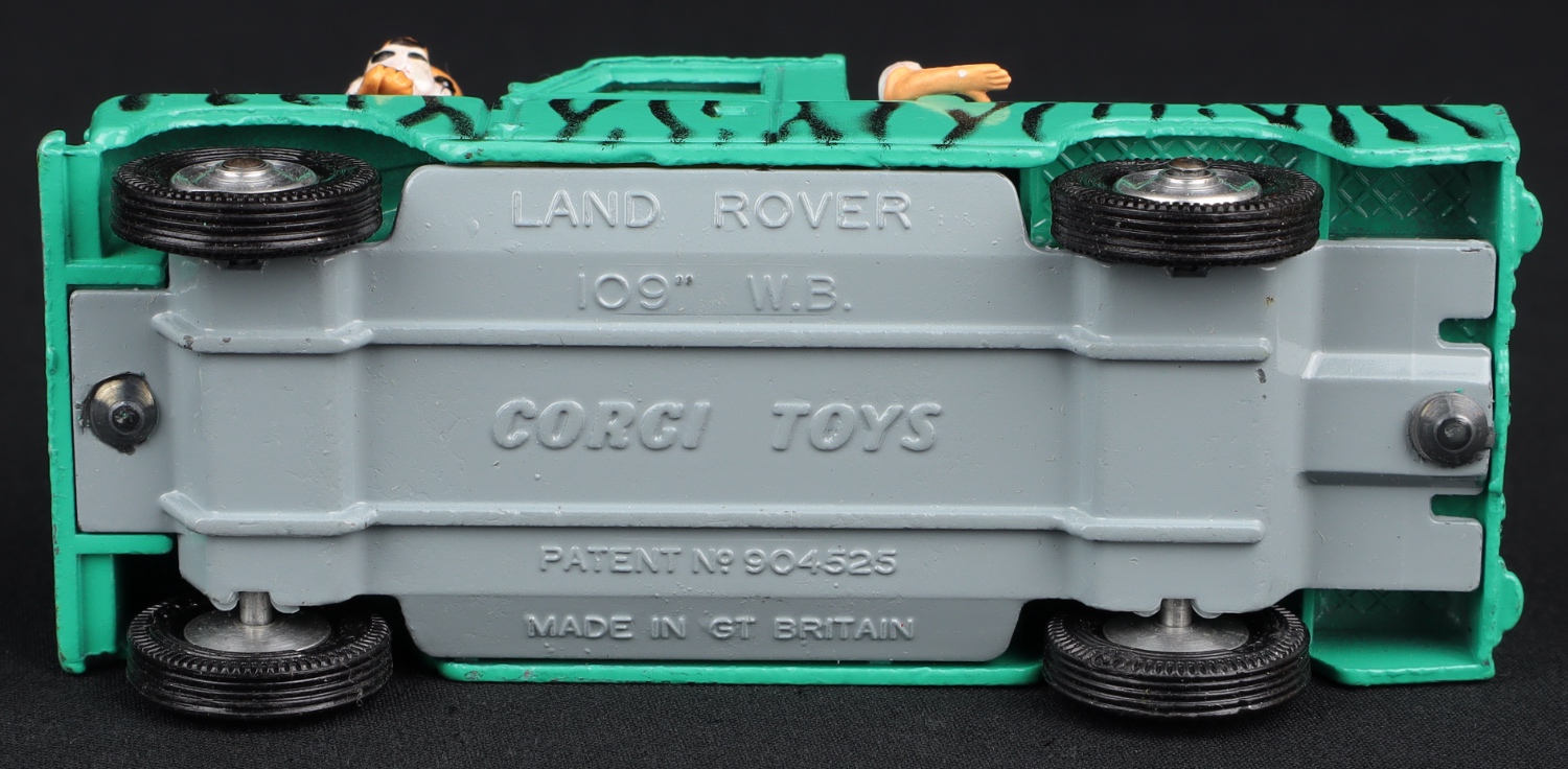1) Corgi 438 Land Rover in green with black stripes. So often the transfer immediately below the windscreen flakes away, this example has a complete transfer notably.