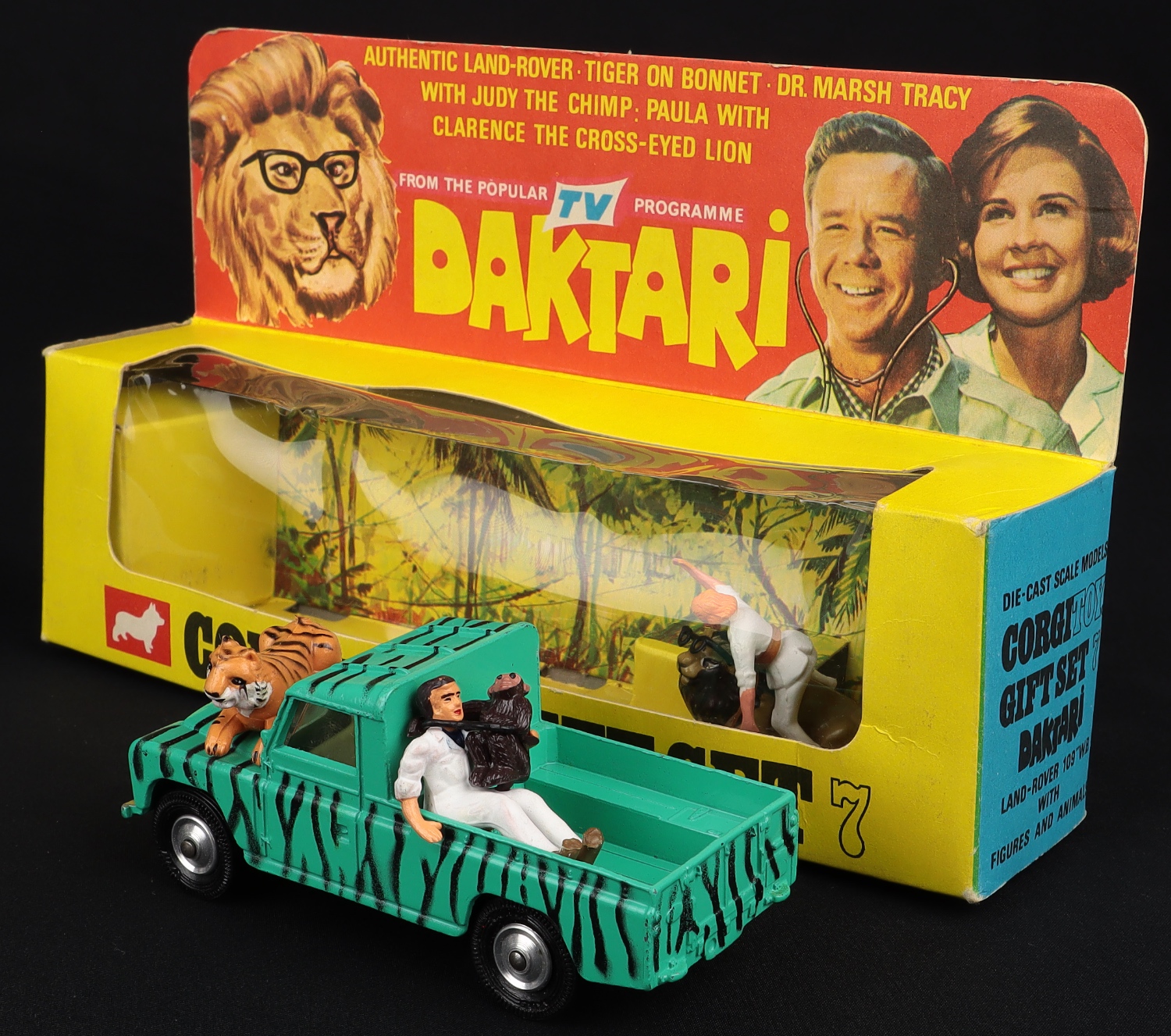 Daktari by Corgi Toys, Gift Set 7. Very, very near mint/boxed. Spun wheels issue, with characters and all accessories. From The Elmer Collection of fine Corgi.